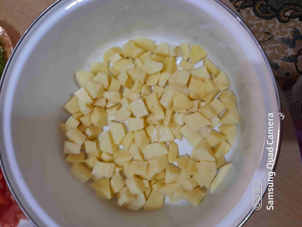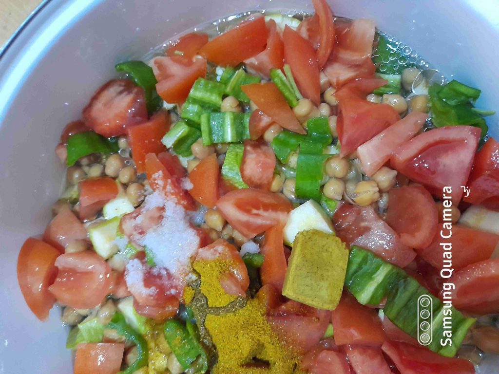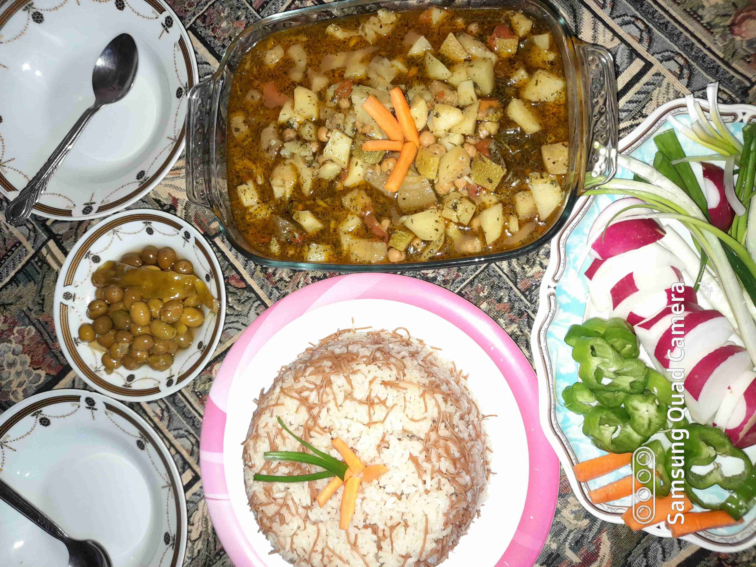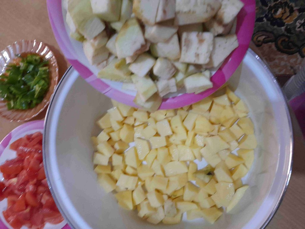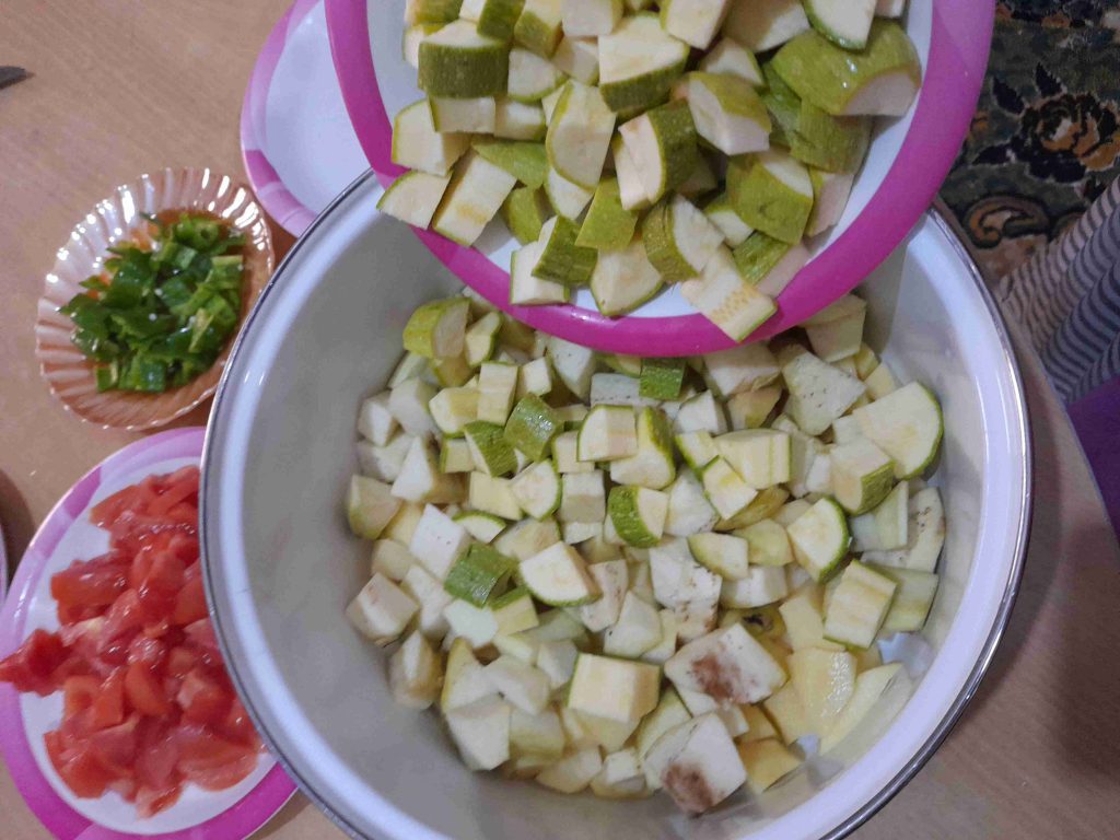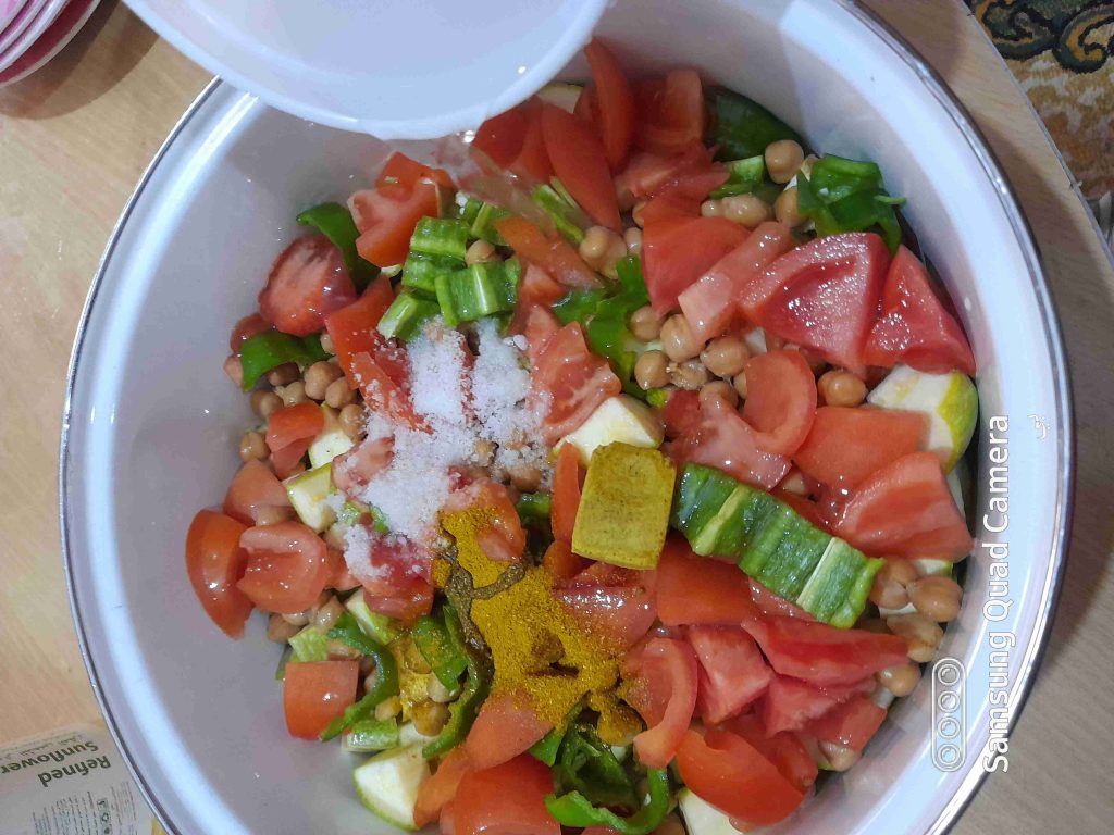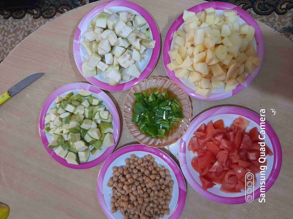 نغرم الخضرا مكعبات متوسطة(طبعاالخضراكلهاحسب افرادالعيلةكميةالخضرايلي رح نحطها) بنطبقها فوق بعض متل يلي بلصورة مع الكاري والملح والماجي ومي دافية ليغمر الخضرا وبنحط الزيت او السمنة وبنغطيها وع غاز متوسط الحرارة