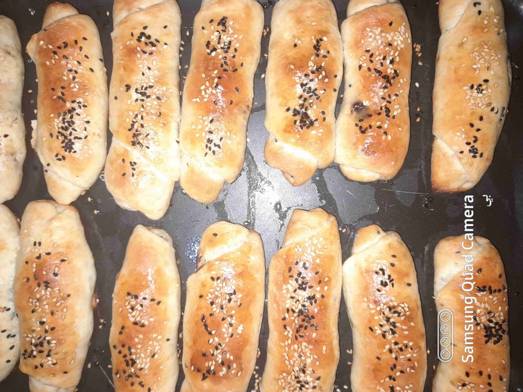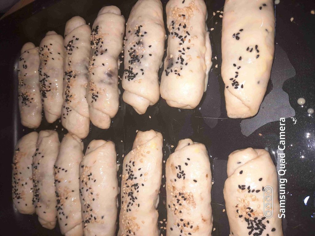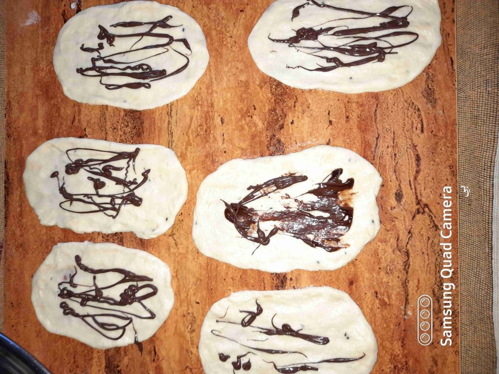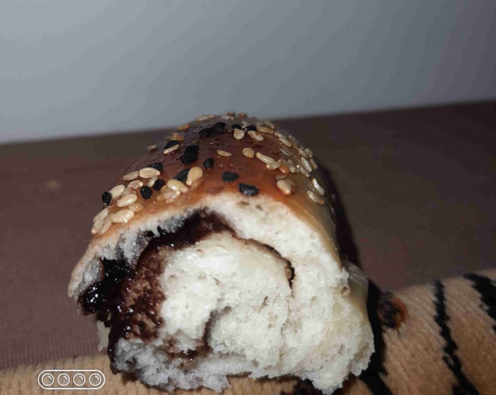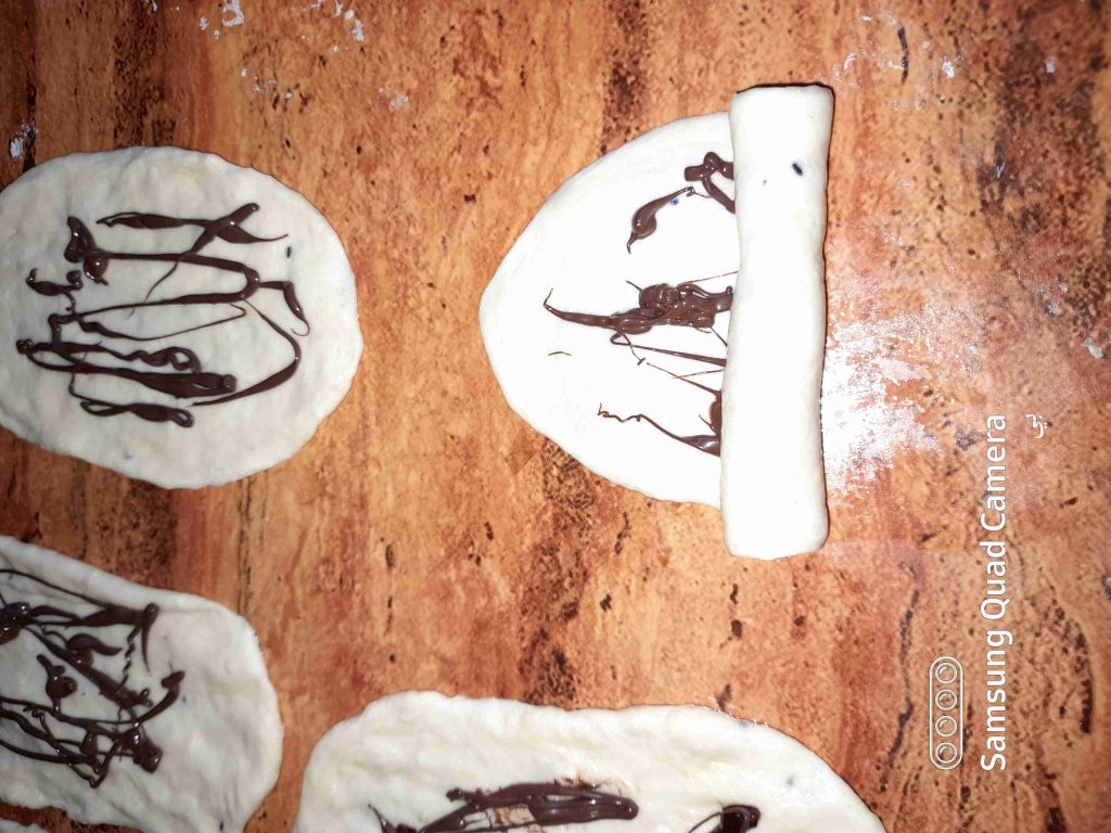 وبنبلش نكورر ونمد العجينة نحط شكولا ونلف متل الملفوف ونصفها بلصينية المدهونة زيت وبنغطيها لترتاح وتتضاعف حجمها بندهنها بخليط التلميع ونرش عليها سمسم وحبة البركة وع الفرن محمى مسبقا من تحت بعد نضوجها بنشغل من فوق وصحتين وهنا