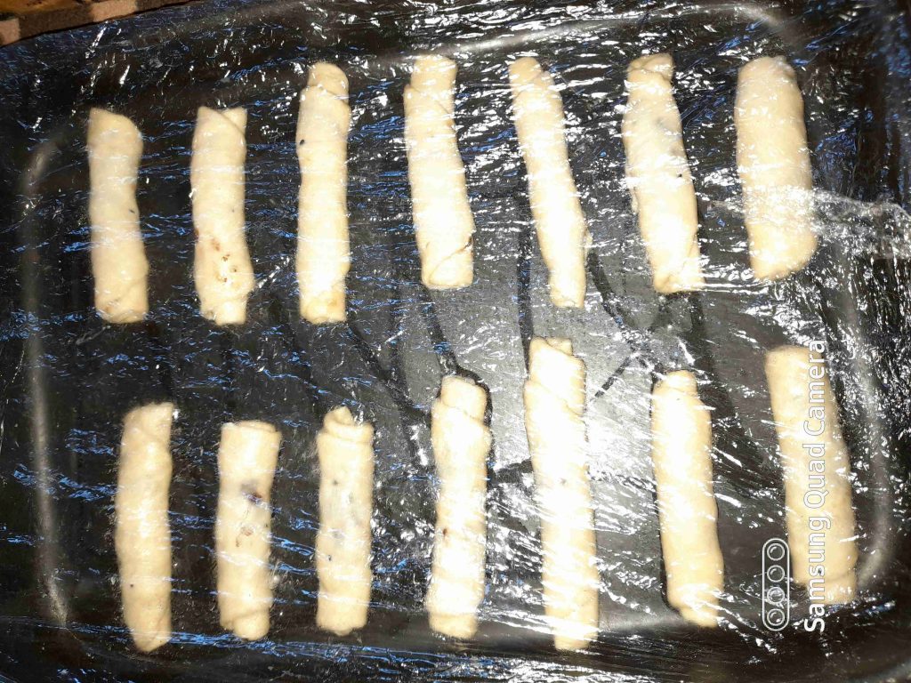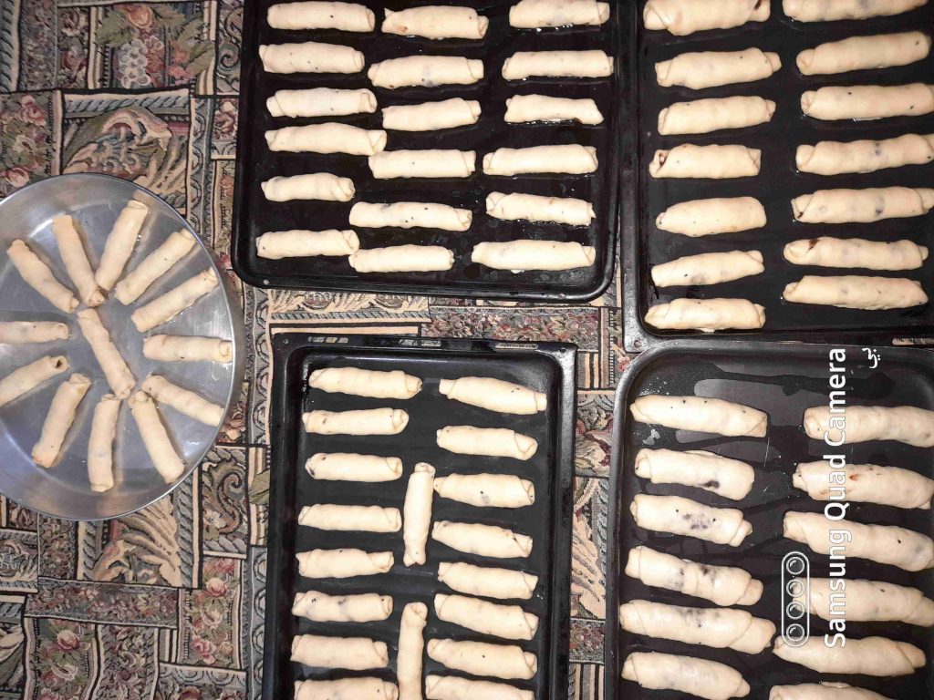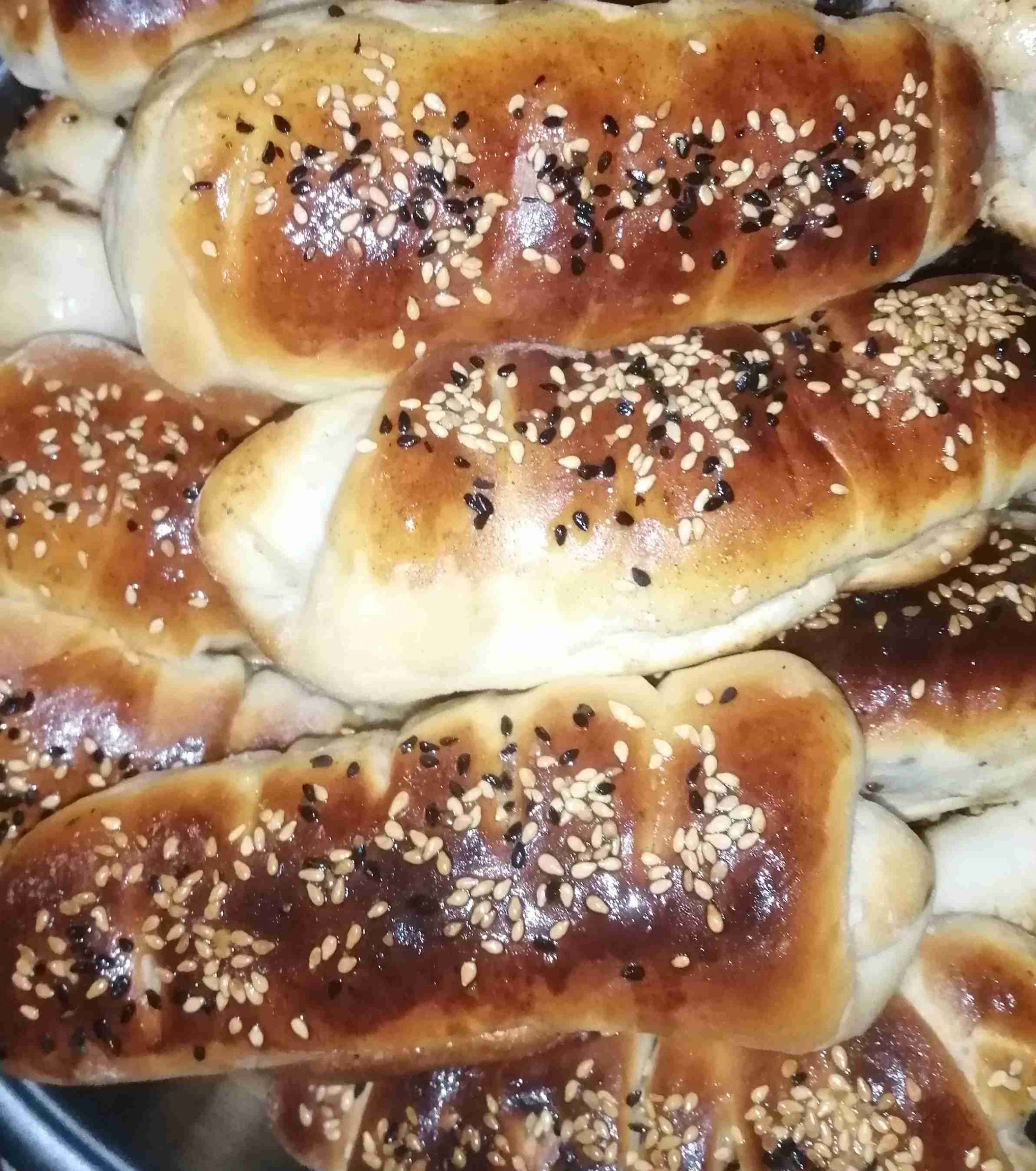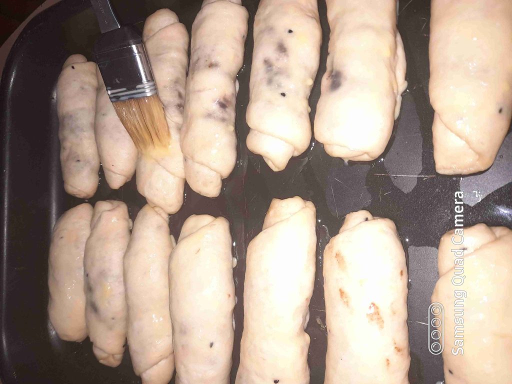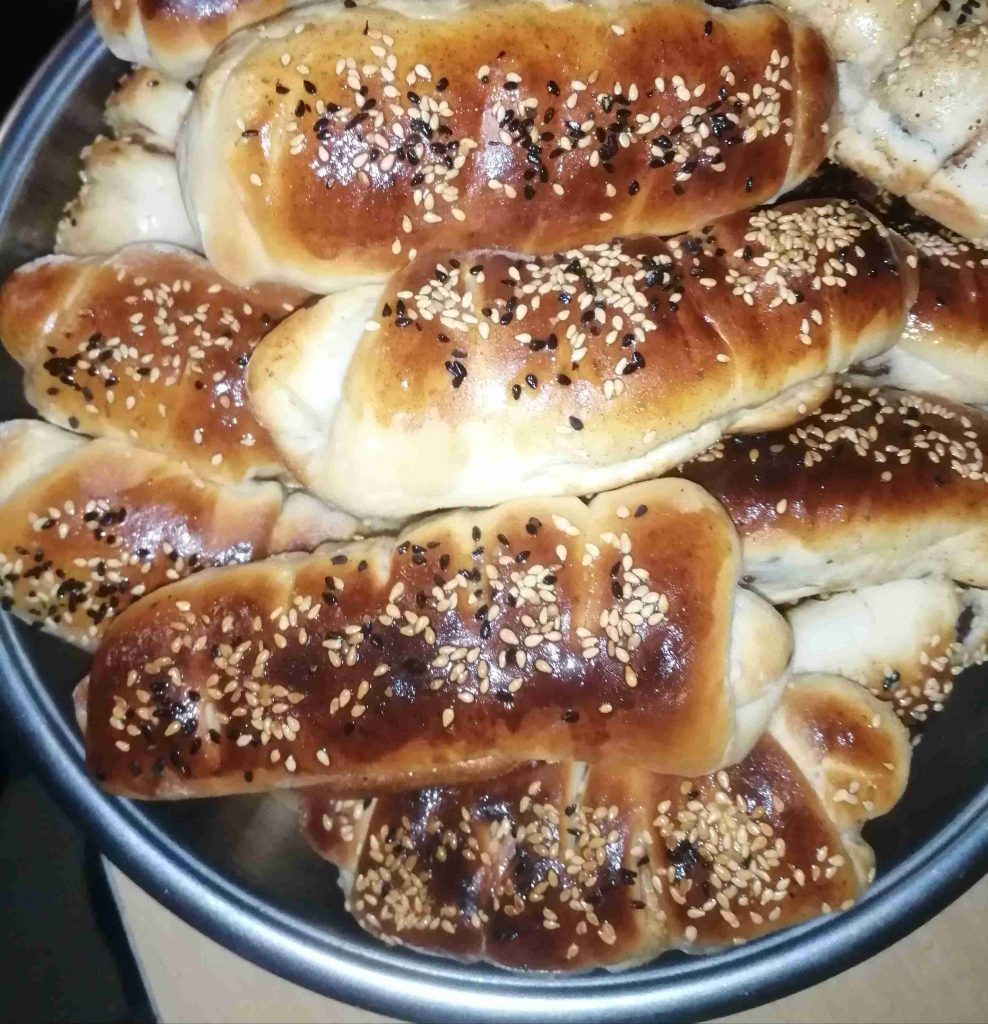 وبنبلش نكورر ونمد العجينة نحط شكولا ونلف متل الملفوف ونصفها بلصينية المدهونة زيت وبنغطيها لترتاح وتتضاعف حجمها بندهنها بخليط التلميع ونرش عليها سمسم وحبة البركة وع الفرن محمى مسبقا من تحت بعد نضوجها بنشغل من فوق وصحتين وهنا