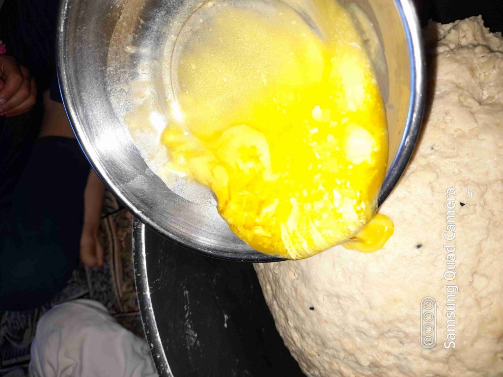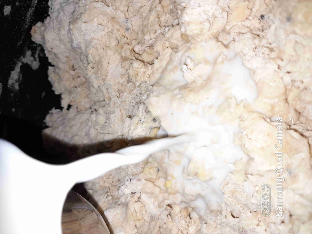 وبعجنها جيدا بيصير متل فتات الخبز بنبلش نصب الحليب ونعجن حتى نشوف العجينة صارت تمام وما عم تلزق بليدنا اخر شي بنضيف الذبدة وبنعجن كمان حتى كل الذبدة ما يبقالها اثر