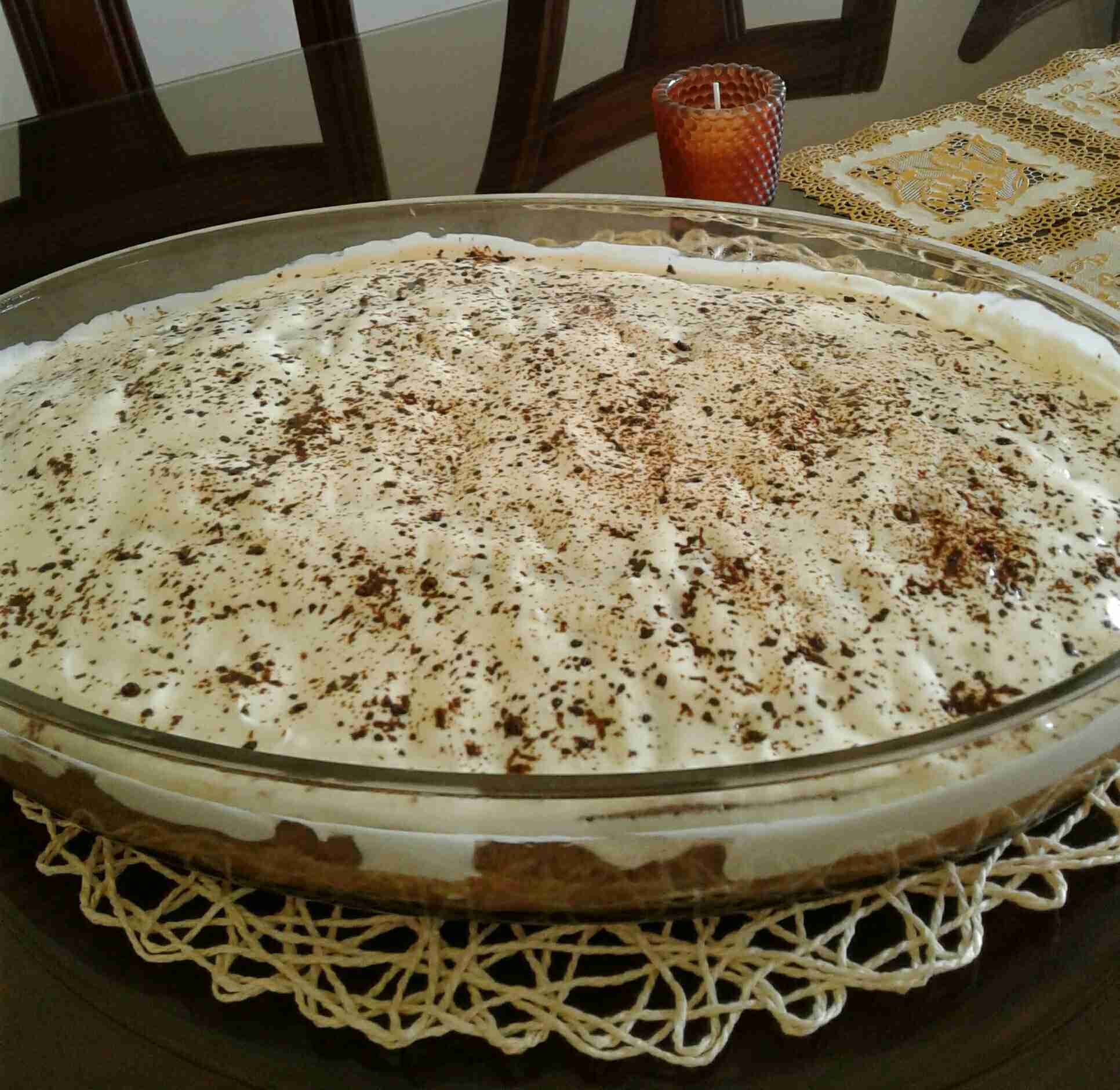 – ندهن سطح الكيك بالقشطة ، ونزينه برشة من حبيبات النسكافيه ، وتقدم.