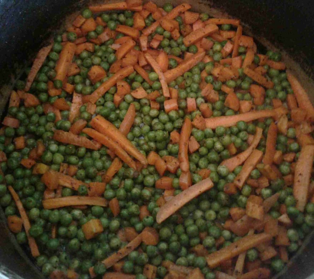– في طنجرة على النار : نضيف الجزر والبازيلاء ونضيف لها الملح والتوابل ونشوحها ونغطيها ونتركها حتى تنضج.