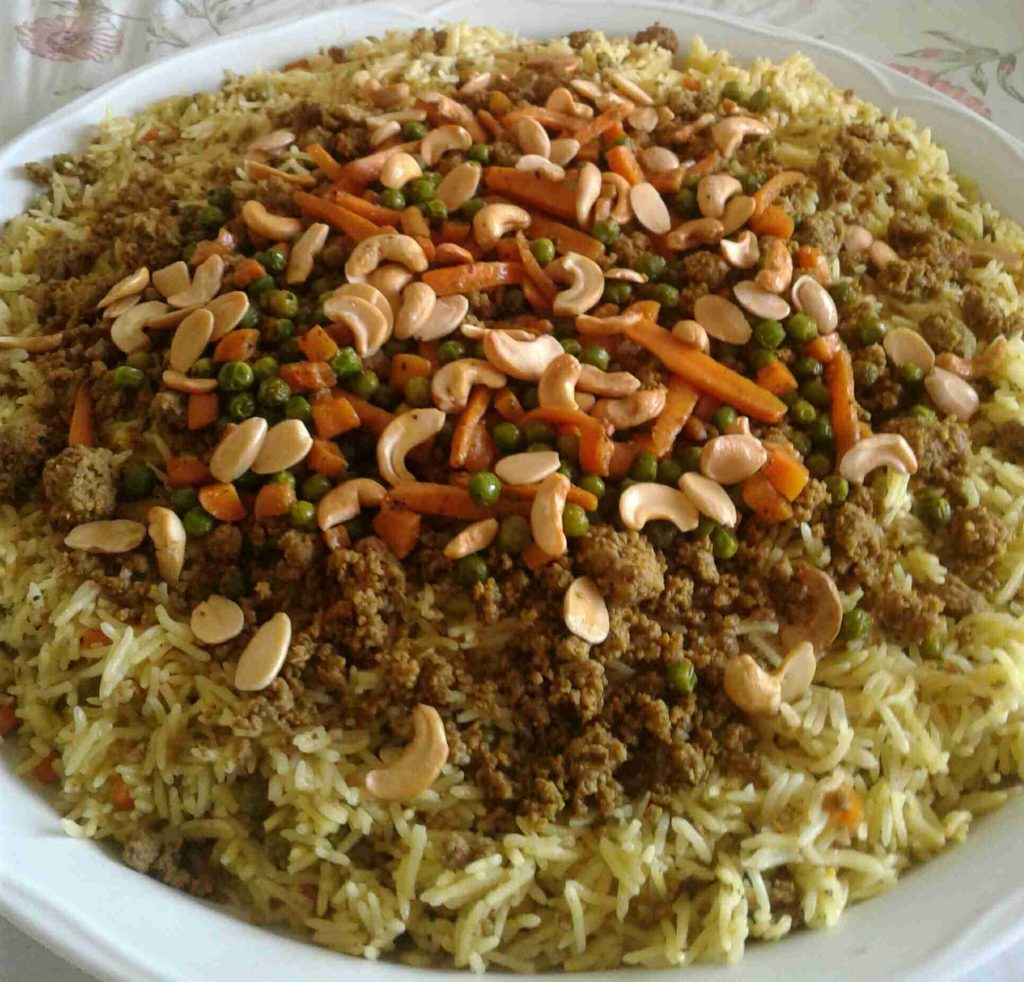 – نسكب الأرز في طبق التقديم ونضع فوقه الأرز والجزر ثم اللحم ثم المكسرات.. ويقدم.