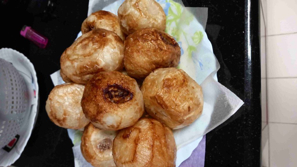 نغسل اللفت جيدا ونقشره وبنحشيه وبنقليه..