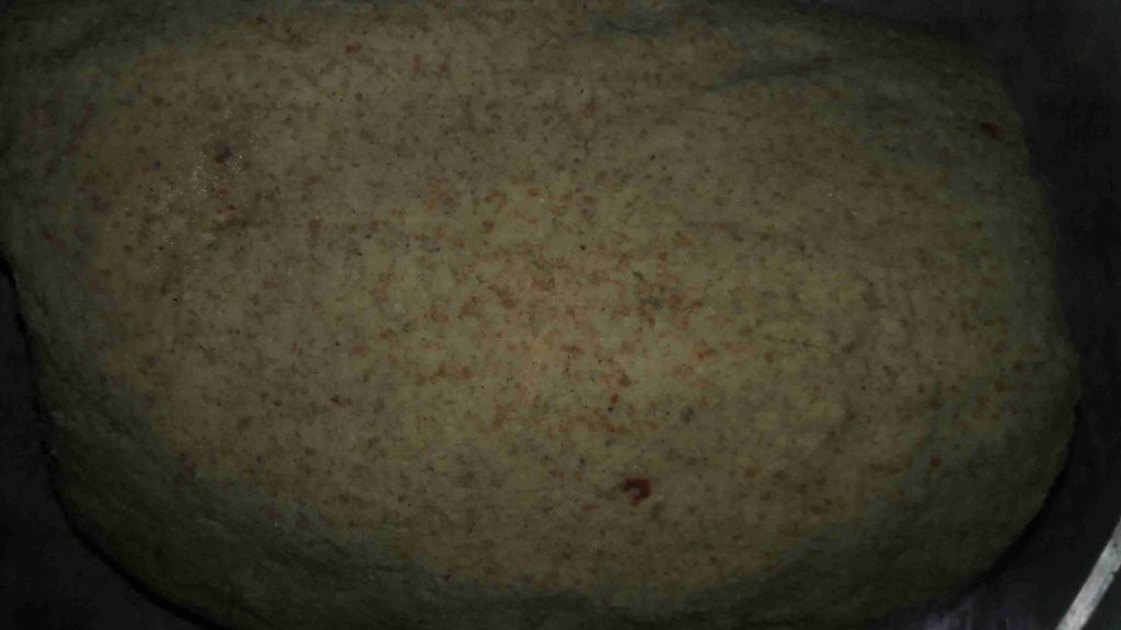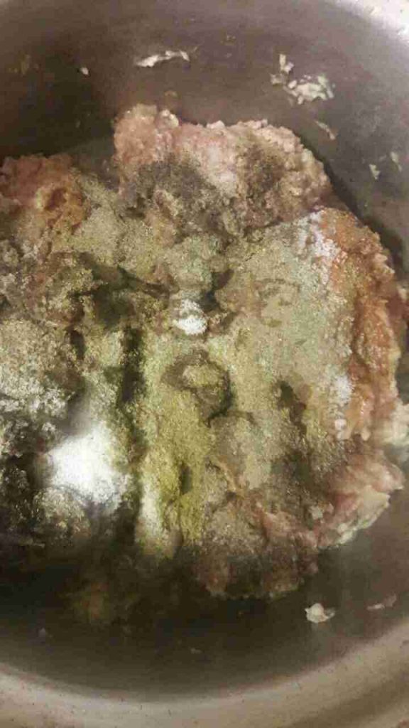 منضيف على البرغل يلي طحناه نصف كمية البهارات يلي مجهزينا والملح حسب الرغبة ونترك الباقي ع جنب لنضيفو للحشوة
