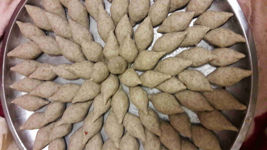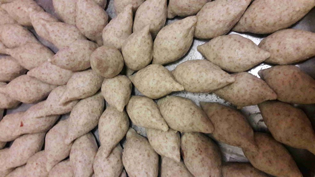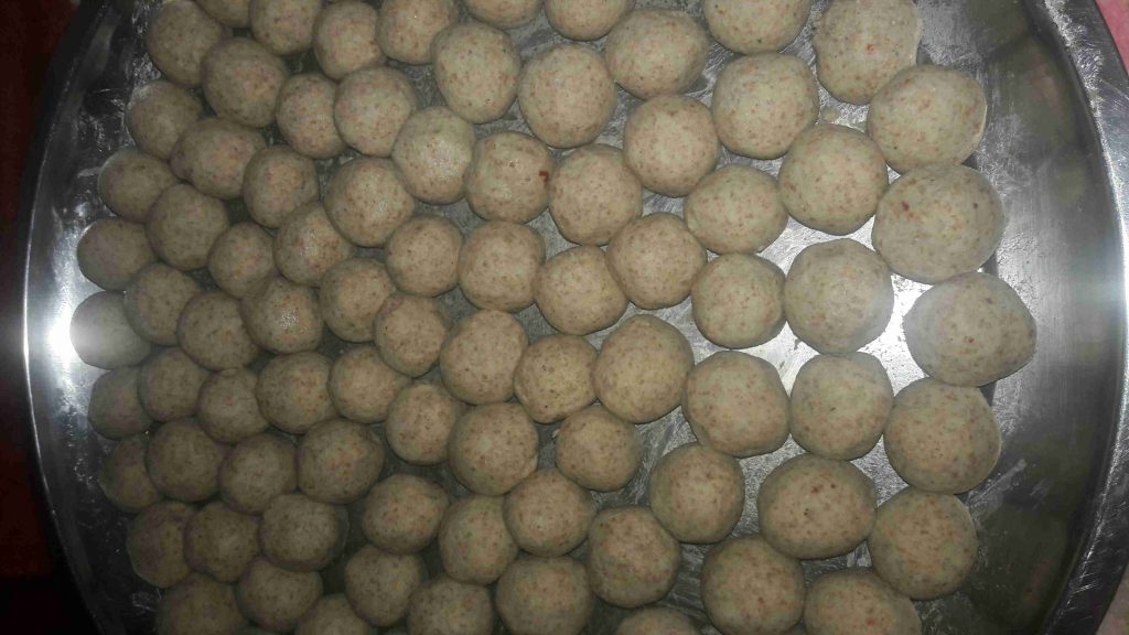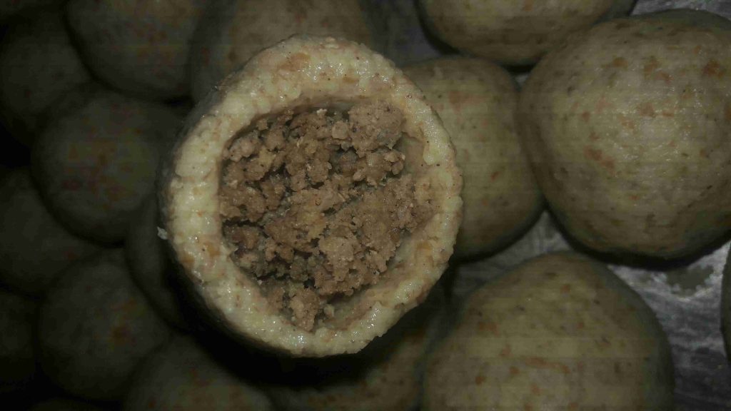 منكور عجينة البرغل لدوائر حسب الحجم يلي بتحبو ومنشكل حبة الكبة حسب الطريقة التقليدية او حسب الشكل يلي بتحبو ومنحشيها بالدجاج يلي حضرناه ومنسكر على الحبة كتير منيح