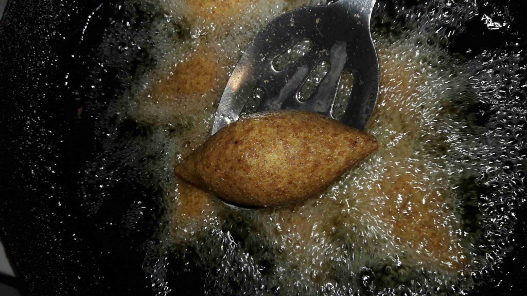 واثناء القلي منحمي الزيت كتير منيح ومنقلي حبات الكبة مباشر وهي مثلجة يعني مامنتركها تفقد التجمد مشان ماتخرب ويروح شكلها