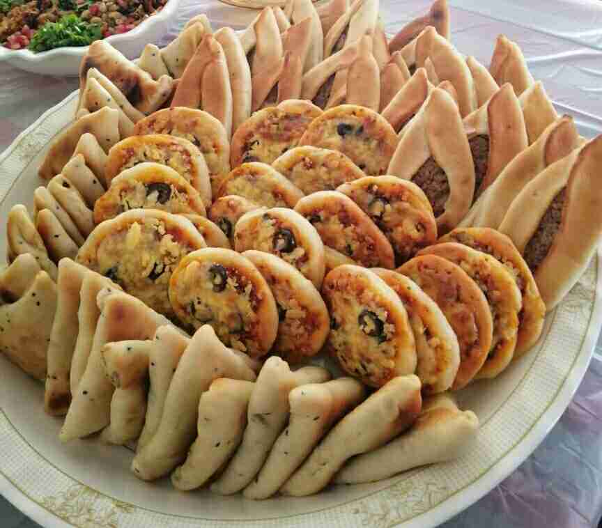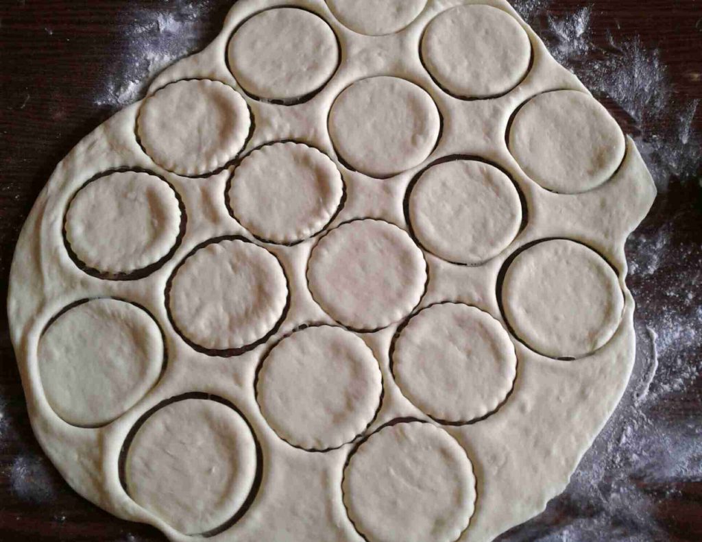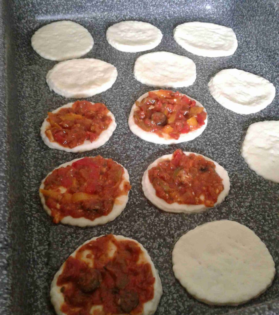 – بعد اختمار العجين: نرش سطح العمل بالطحين ، ونفرد العجين فوقه باستخدام مرق العجين بسماكة نصف سنتيمتر ونقطعه دوائر بالحجم المرغوب ، أو نكور العجين بالحجم المرغوب به ونرق كل كرة لوحدها بواسطة اليد.
