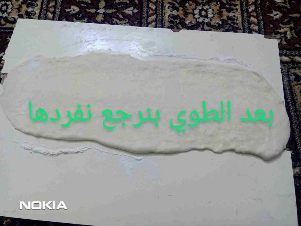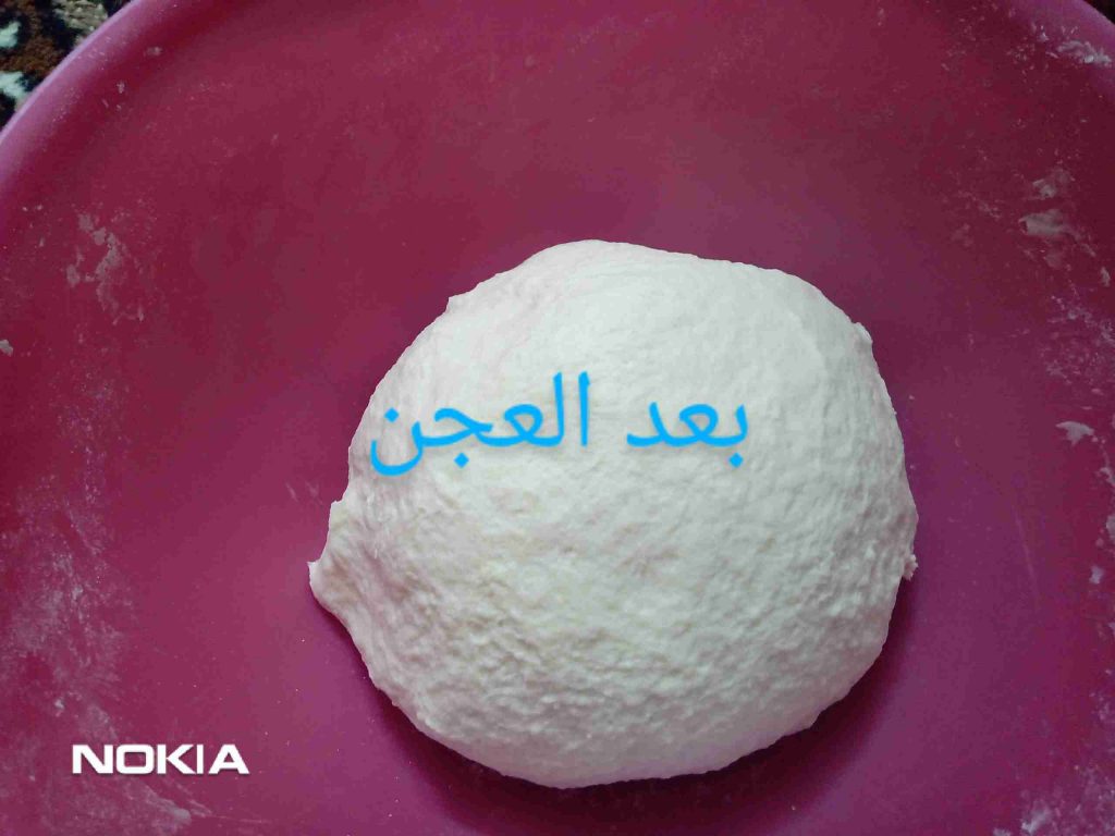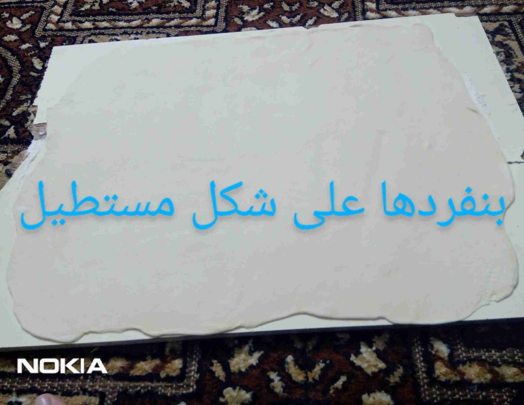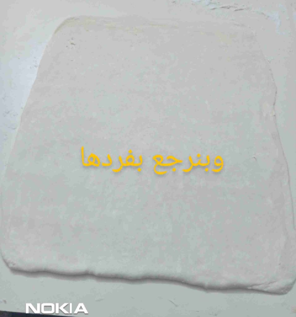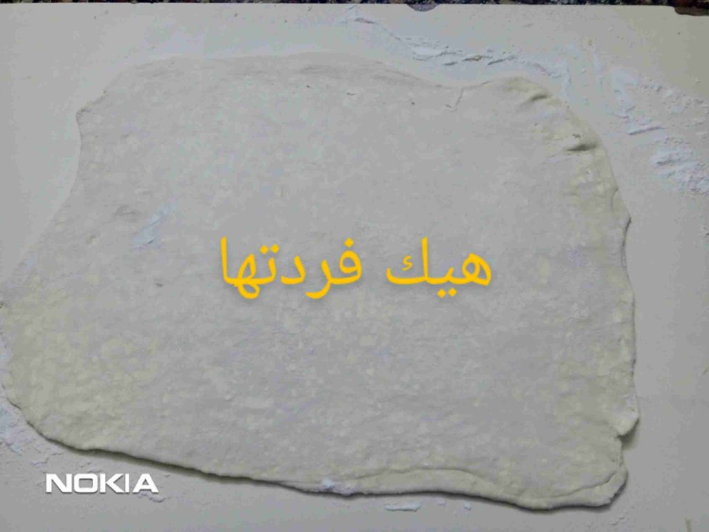 وملعقة صغيرة خل ابيض وبنضيف ٢٥غرام زبدة وبنفرك الزبدة مع الطحين منيح وبعدين بنضيف من كوب لكوب ونص ماء بارد تدريجيا حسب حاجة الطحين وبنعجن وبنضيف المي بتدريج لحتا تتشكل عجينة ناعمة مابتلزق بالايد انا احتاجت مع كاس ونص مي مدة عجبنا عشر دقائق وبنحطها بطبق وبنغطيها وبنتركها ترتاح ساعة وبس ترتاح بناخذ العجينة وبنرش على سطح العمل رشة طحين وبنحط العجينة وبنرش عالعجينة رشة طحين وبنرقها على شكل مستطيل