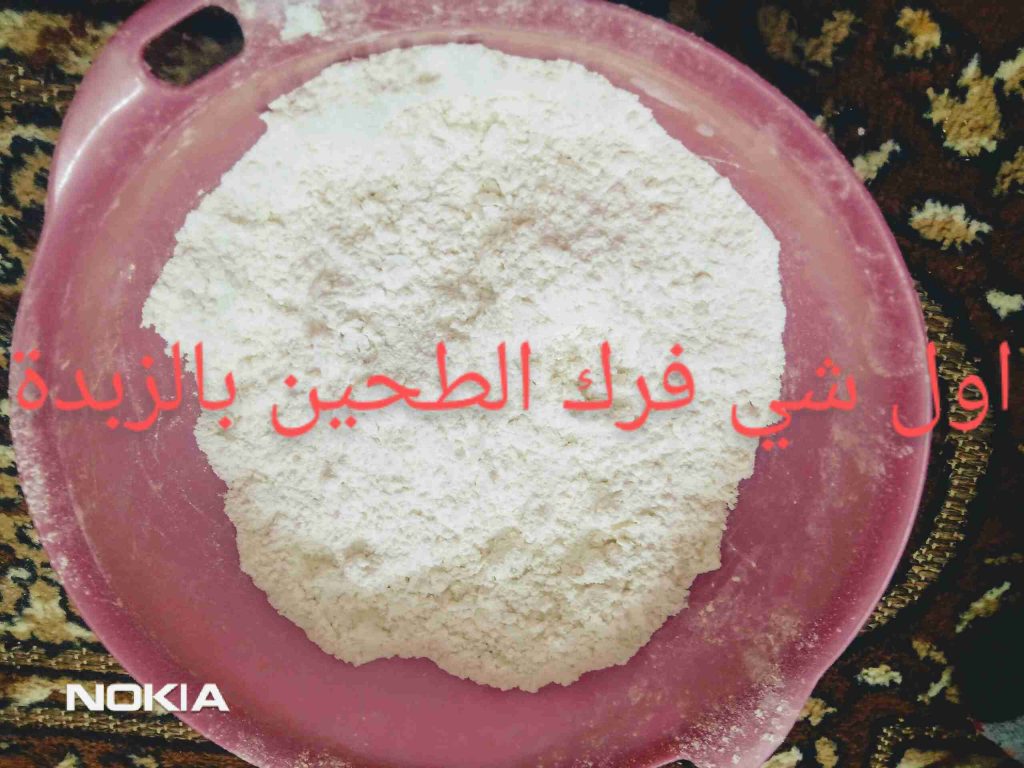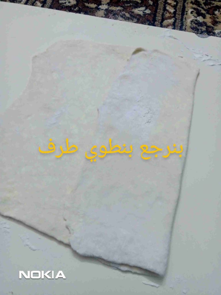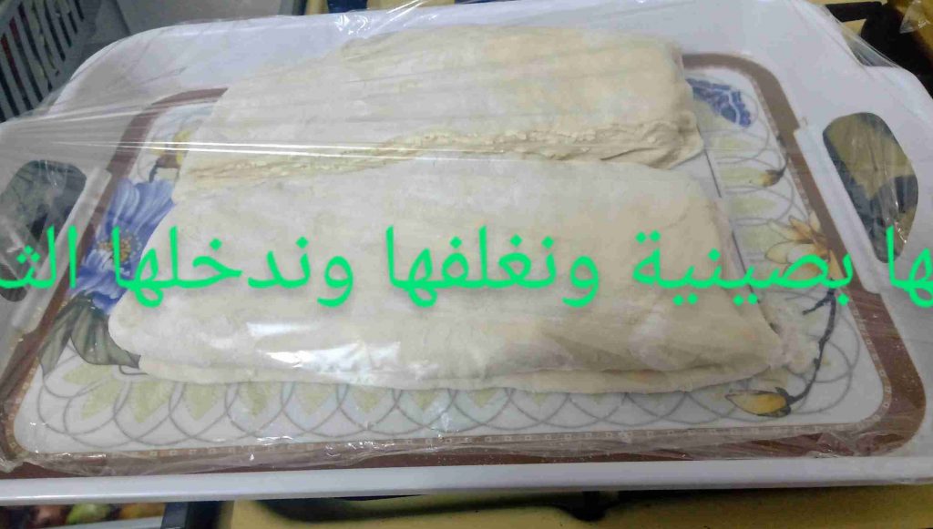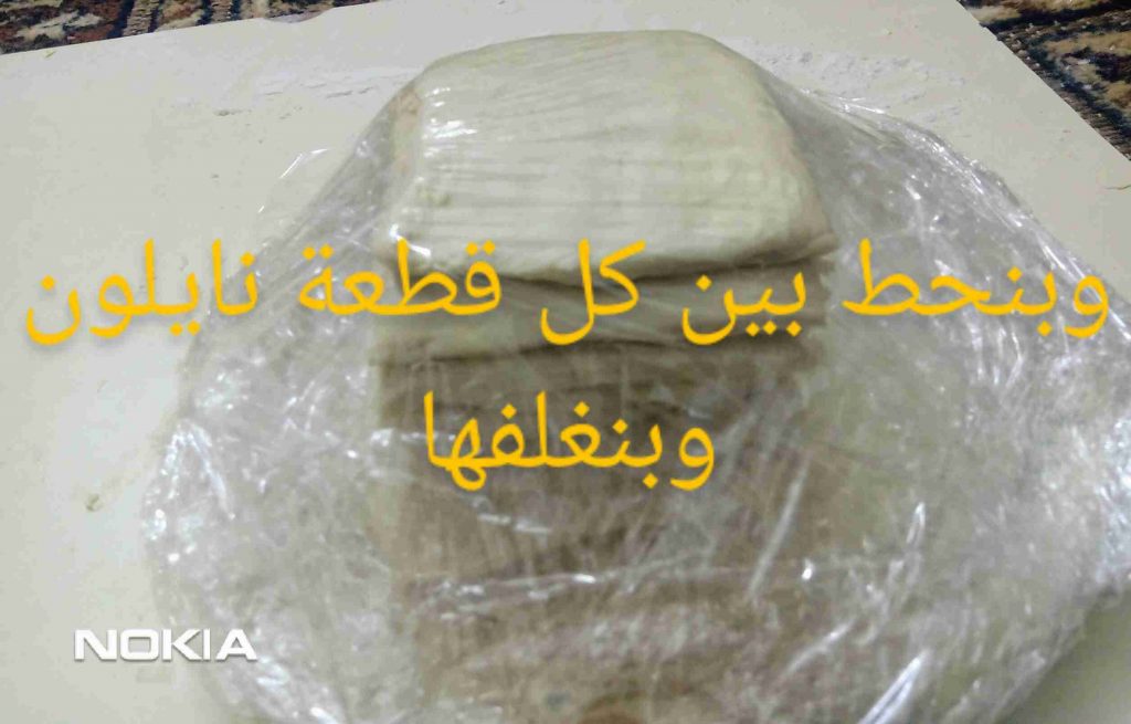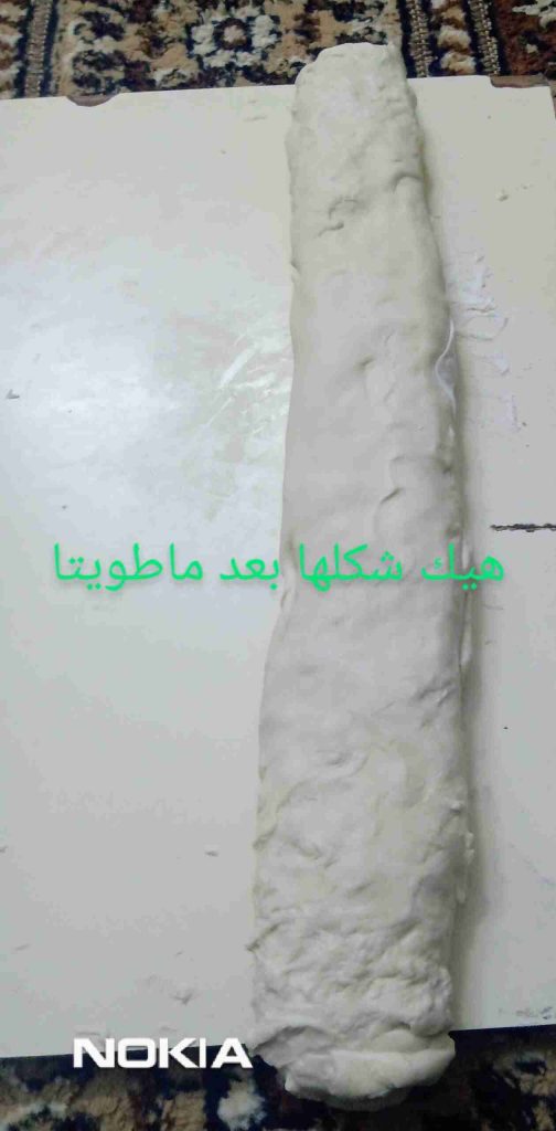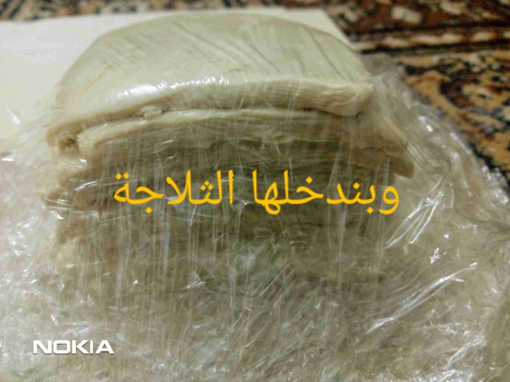 وملعقة صغيرة خل ابيض وبنضيف ٢٥غرام زبدة وبنفرك الزبدة مع الطحين منيح وبعدين بنضيف من كوب لكوب ونص ماء بارد تدريجيا حسب حاجة الطحين وبنعجن وبنضيف المي بتدريج لحتا تتشكل عجينة ناعمة مابتلزق بالايد انا احتاجت مع كاس ونص مي مدة عجبنا عشر دقائق وبنحطها بطبق وبنغطيها وبنتركها ترتاح ساعة وبس ترتاح بناخذ العجينة وبنرش على سطح العمل رشة طحين وبنحط العجينة وبنرش عالعجينة رشة طحين وبنرقها على شكل مستطيل
