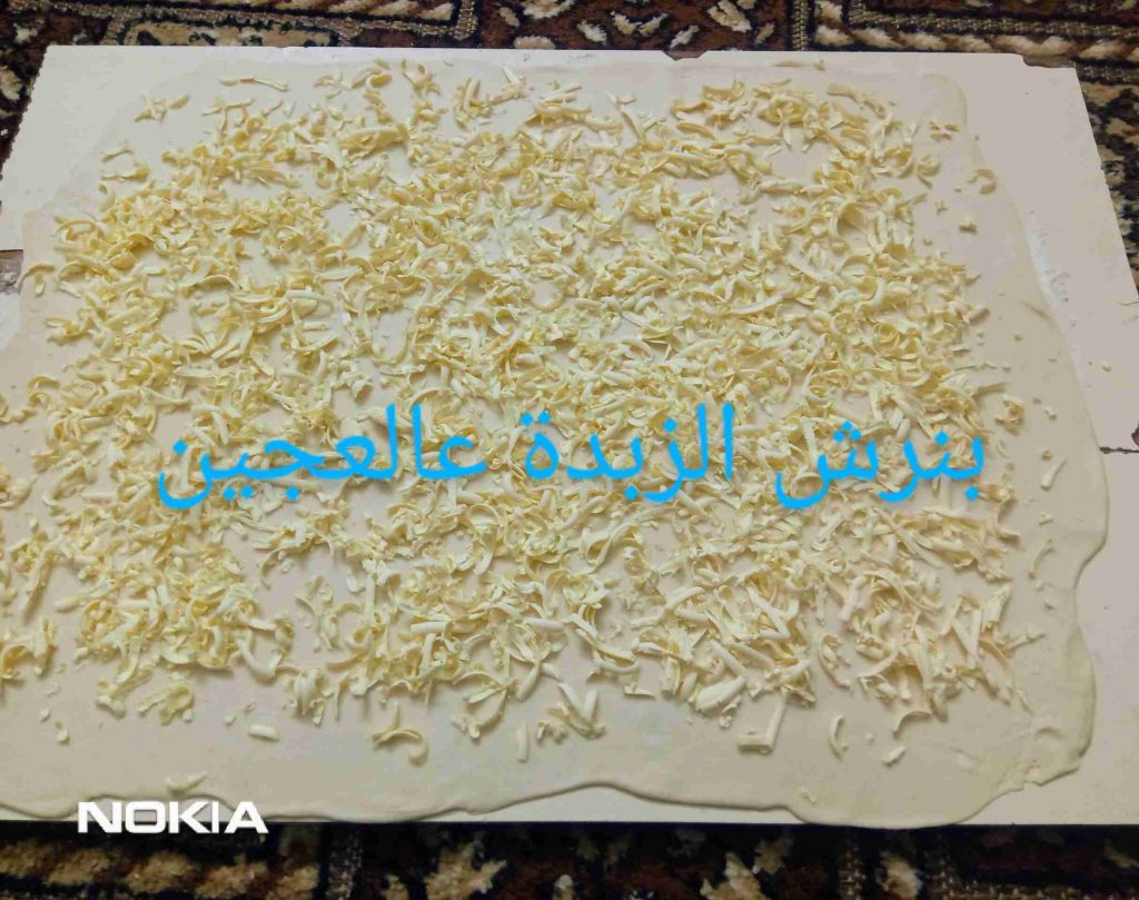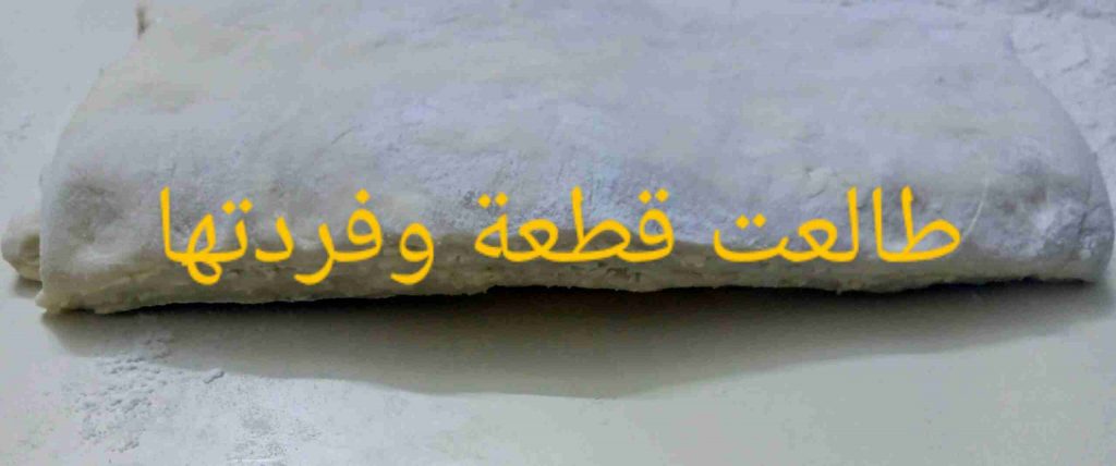 كبير بنكون حاطين الزبدة بالثلاجة منشان يسهل علينا بشرها بنحتاج ٣٠٠غرام من الزبدة بنبرش الزبدة عالعجينة وبنوزعها بشكل كامل وبنطويها خمس طويات وبعد الطوي بنرش عليها طحين وبنرقها على شكل مستطيل وبنطوي طرف لحد نص المستطيل وبنطوي الطرف الثاني كمان للنصف وبعدها بنطوي الكويات على بعضن بنقطع العجينة للنصفين وبنحطها بصينية وبندخها الفريزة مدة نص ساعة وبعد نص ساعة بناخذ قطعة من العجين وبنرجع القطعة الثانية عالثلاجة