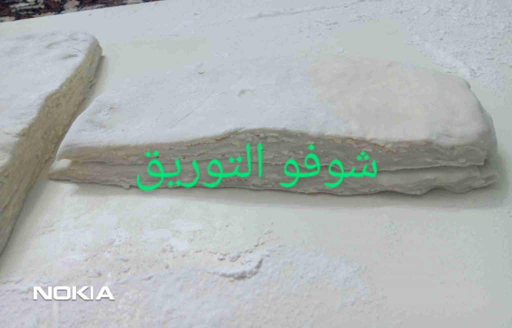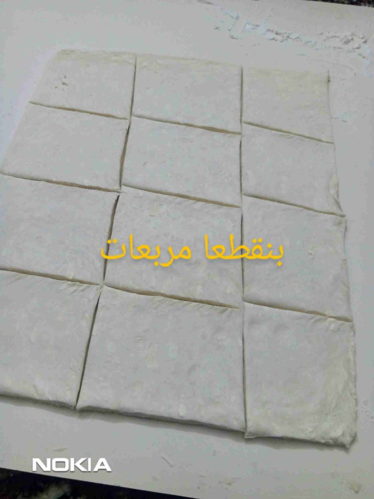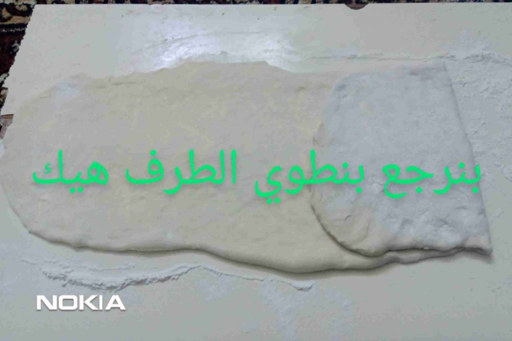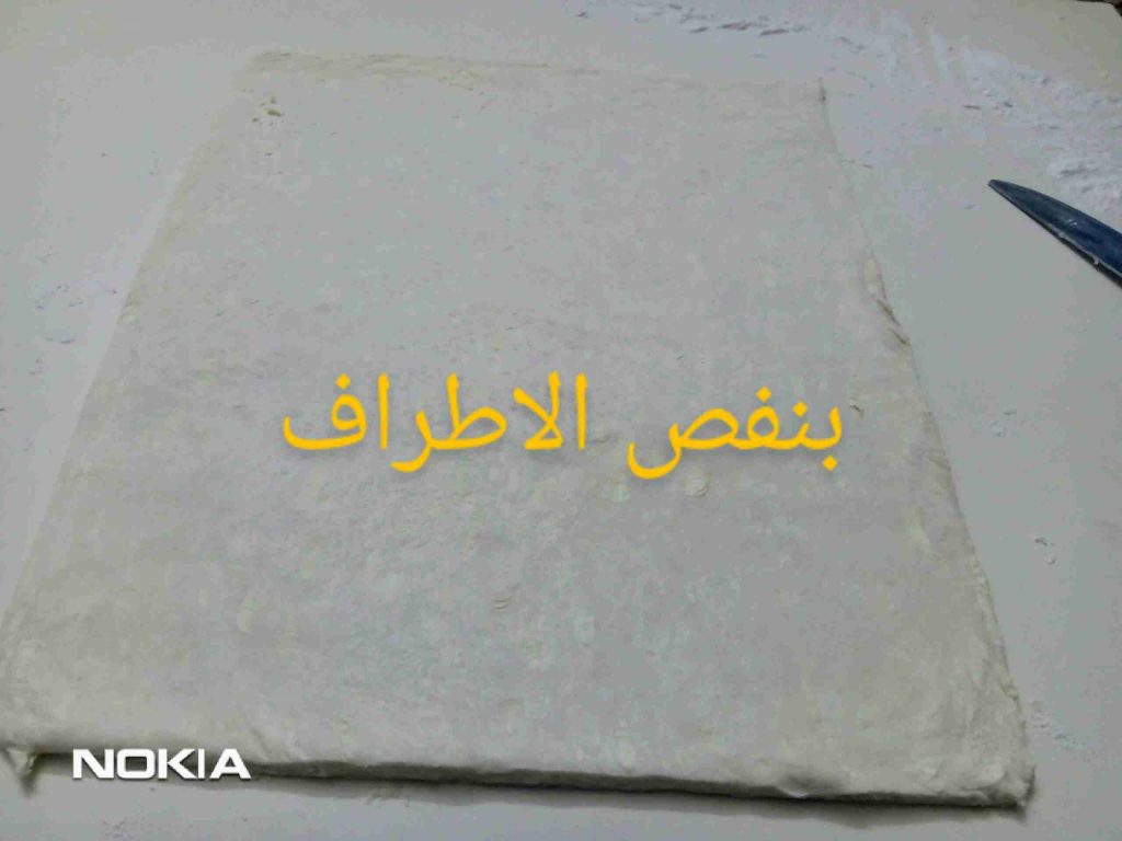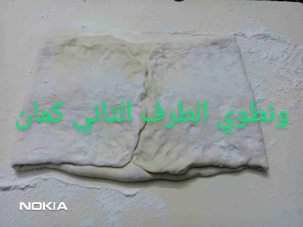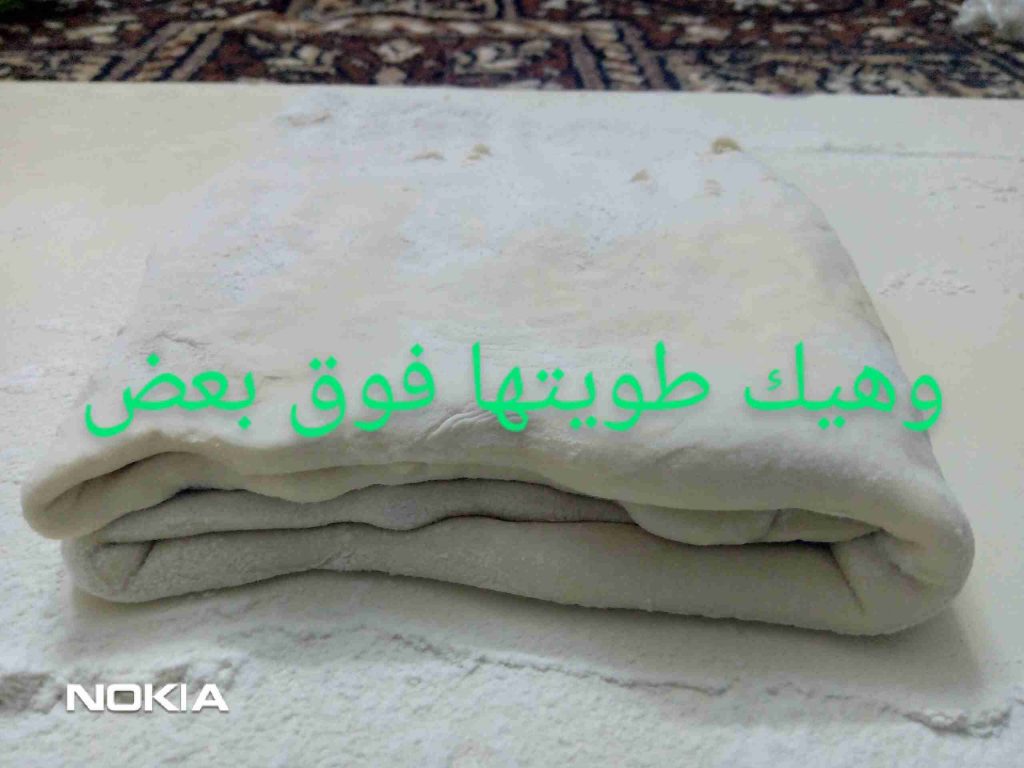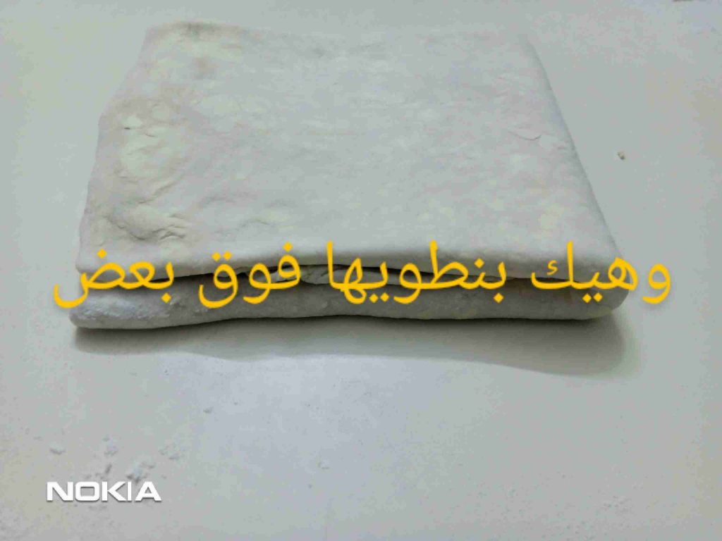 وبنرش على سطح العجينة رشة طحين وبنرقها على شكل مستطيل وبنطوي طرف من العجين وبنرجع بنطوي الطرف الثاني فوق الاول هيك بتصير ثلاث طبقات بشكل مستطيل طويل بنرجع بنطوي كمان طويات صغار فوق بعضن وبنرقها للمرة الاخيرة بشكل مستطيل وبنقص الاطراف بشكل متساوي وهيك صارت جاهزة بهي المرحلة بتحبي تقطيعها او بتحبي تتركيها على حالها حسب حاجتك ممكن تستخدميها فورا واذا حبيبتي تفرزيها اذا قطعتيها مربعات حطي بين كل قطعة ورق زبدة او نايلون وغلفيها وحطيها بالفريزة وعند بدك تستخدميها طالعيها قبل ساعة انا عملتها وربات مابتحتاج الصينية تدهنيها شي بس احشيها وحطيها بصينية وخبزيها ان شالله تكون فهمتو على شرحي لانو مراحلها كثيرة ولهيك حاولت اشرح طريقة عملها بالتسلسل بالصور وصحة وهنا