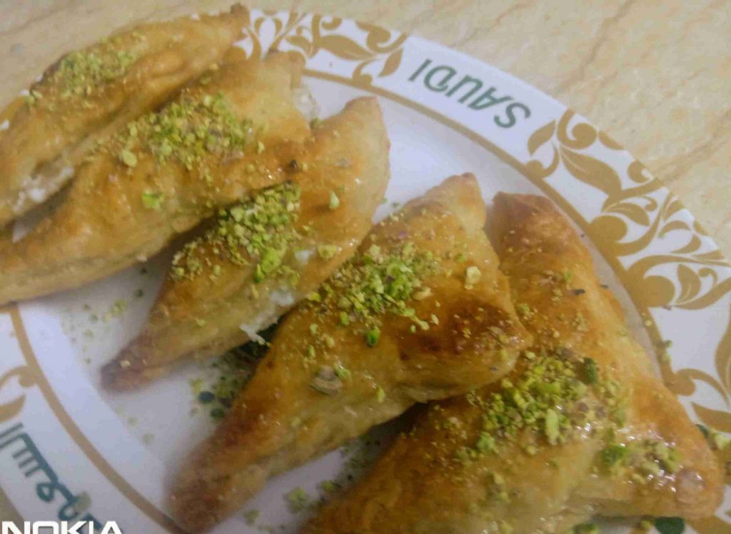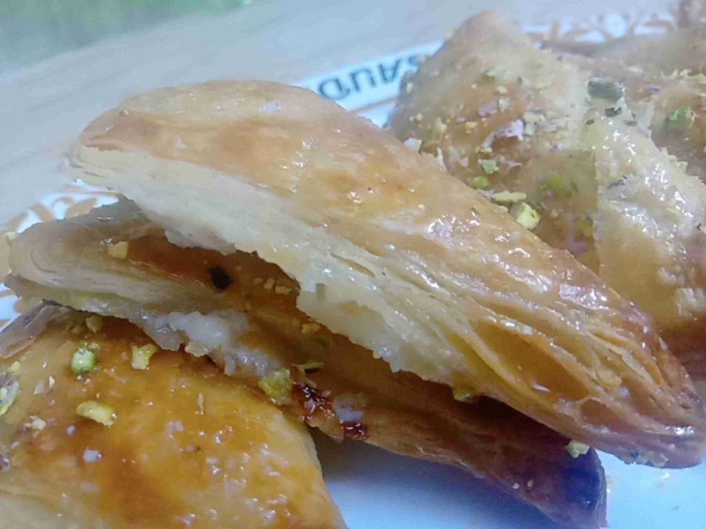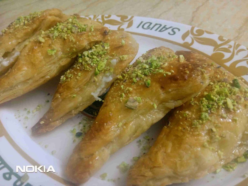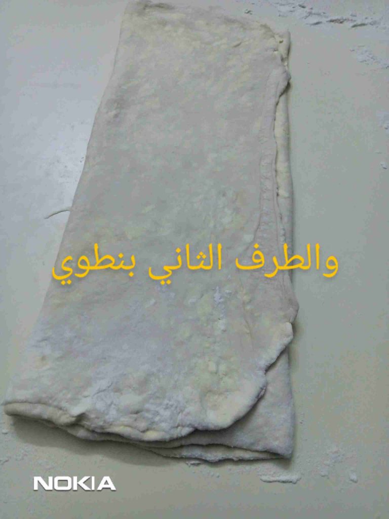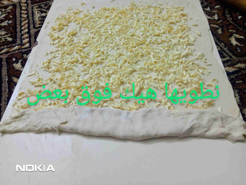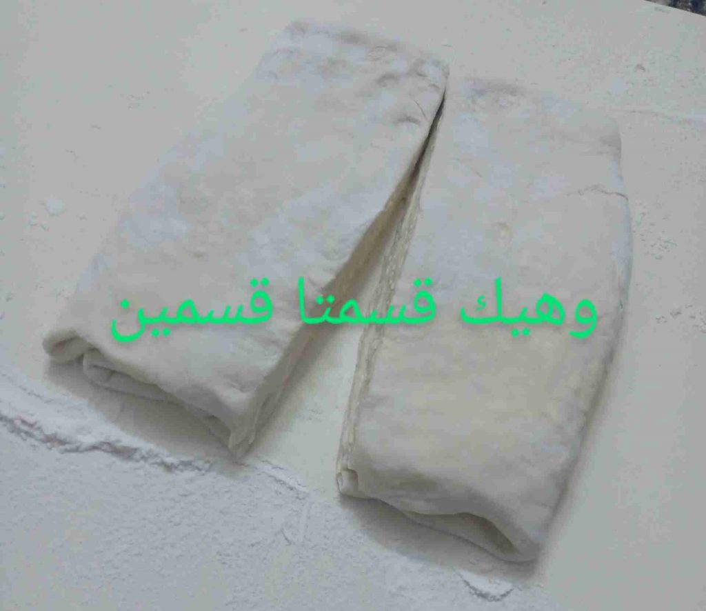 وبنرش على سطح العجينة رشة طحين وبنرقها على شكل مستطيل وبنطوي طرف من العجين وبنرجع بنطوي الطرف الثاني فوق الاول هيك بتصير ثلاث طبقات بشكل مستطيل طويل بنرجع بنطوي كمان طويات صغار فوق بعضن وبنرقها للمرة الاخيرة بشكل مستطيل وبنقص الاطراف بشكل متساوي وهيك صارت جاهزة بهي المرحلة بتحبي تقطيعها او بتحبي تتركيها على حالها حسب حاجتك ممكن تستخدميها فورا واذا حبيبتي تفرزيها اذا قطعتيها مربعات حطي بين كل قطعة ورق زبدة او نايلون وغلفيها وحطيها بالفريزة وعند بدك تستخدميها طالعيها قبل ساعة انا عملتها وربات مابتحتاج الصينية تدهنيها شي بس احشيها وحطيها بصينية وخبزيها ان شالله تكون فهمتو على شرحي لانو مراحلها كثيرة ولهيك حاولت اشرح طريقة عملها بالتسلسل بالصور وصحة وهنا