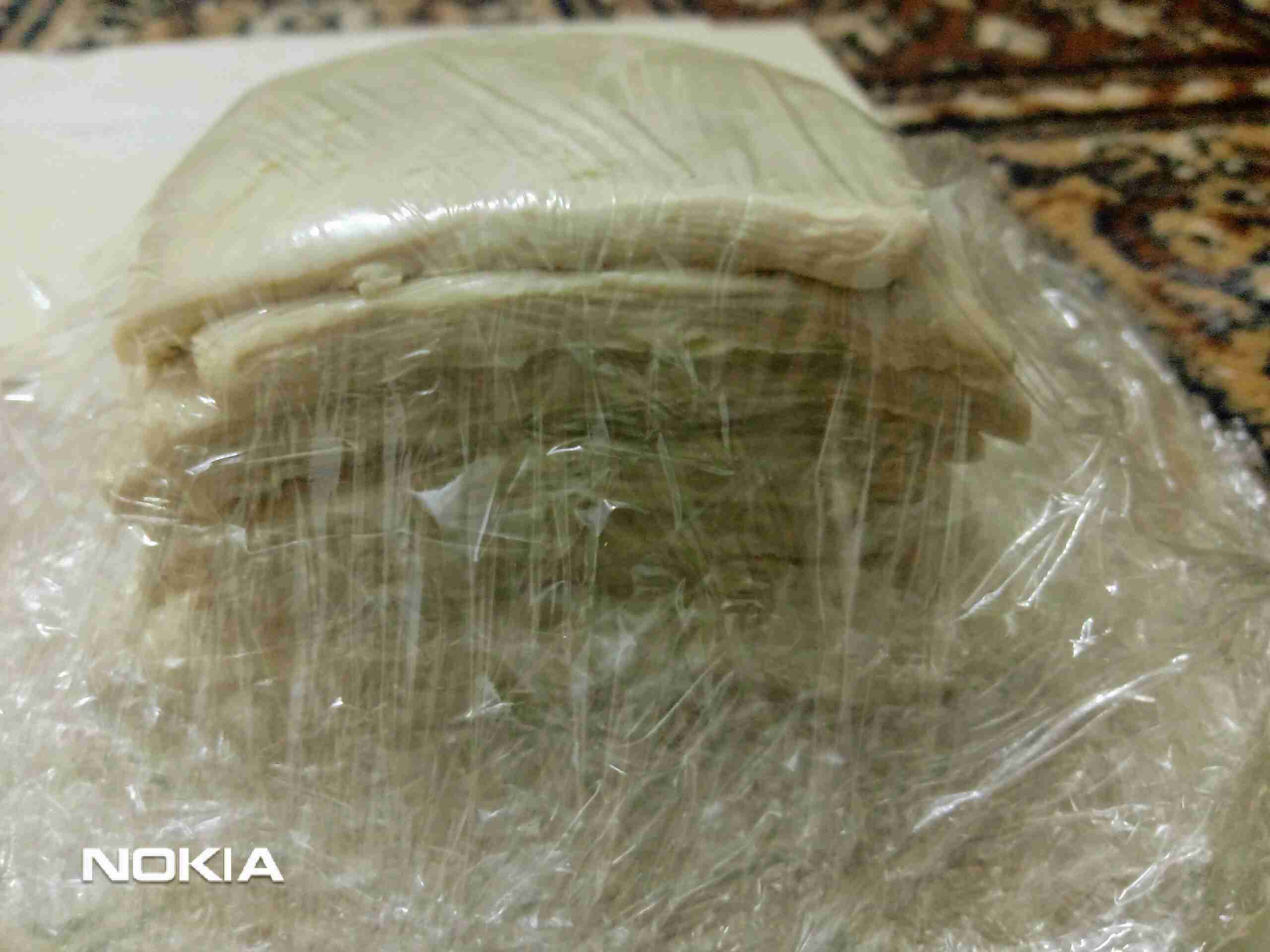 وملعقة صغيرة خل ابيض وبنضيف ٢٥غرام زبدة وبنفرك الزبدة مع الطحين منيح وبعدين بنضيف من كوب لكوب ونص ماء بارد تدريجيا حسب حاجة الطحين وبنعجن وبنضيف المي بتدريج لحتا تتشكل عجينة ناعمة مابتلزق بالايد انا احتاجت مع كاس ونص مي مدة عجبنا عشر دقائق وبنحطها بطبق وبنغطيها وبنتركها ترتاح ساعة وبس ترتاح بناخذ العجينة وبنرش على سطح العمل رشة طحين وبنحط العجينة وبنرش عالعجينة رشة طحين وبنرقها على شكل مستطيل