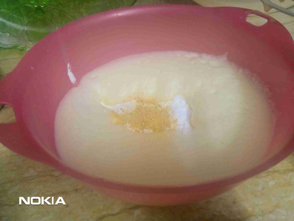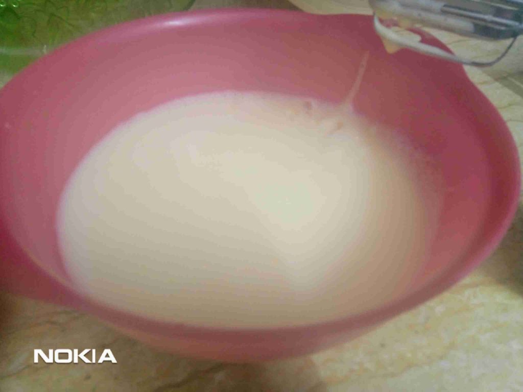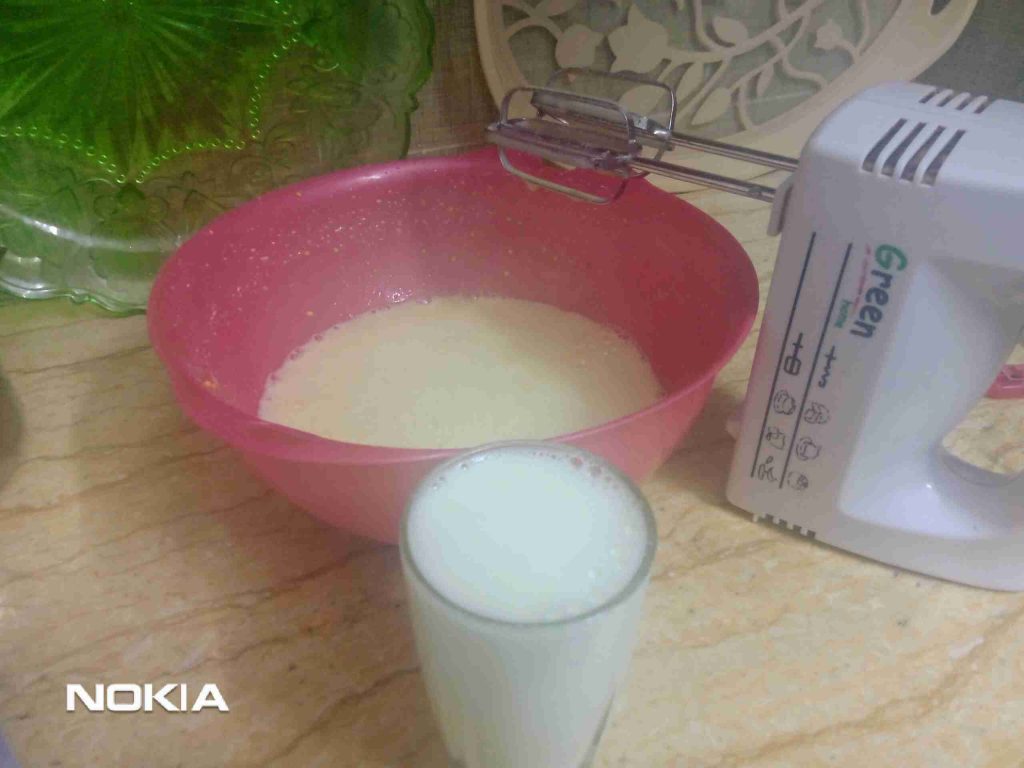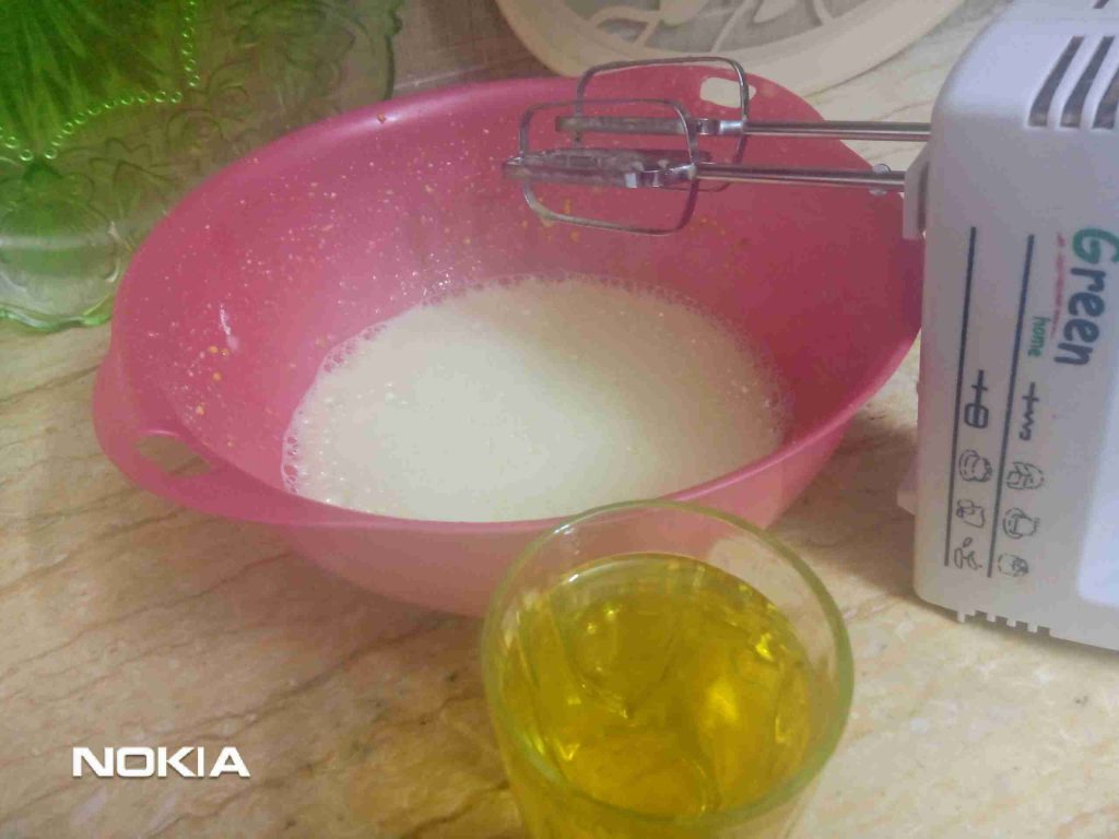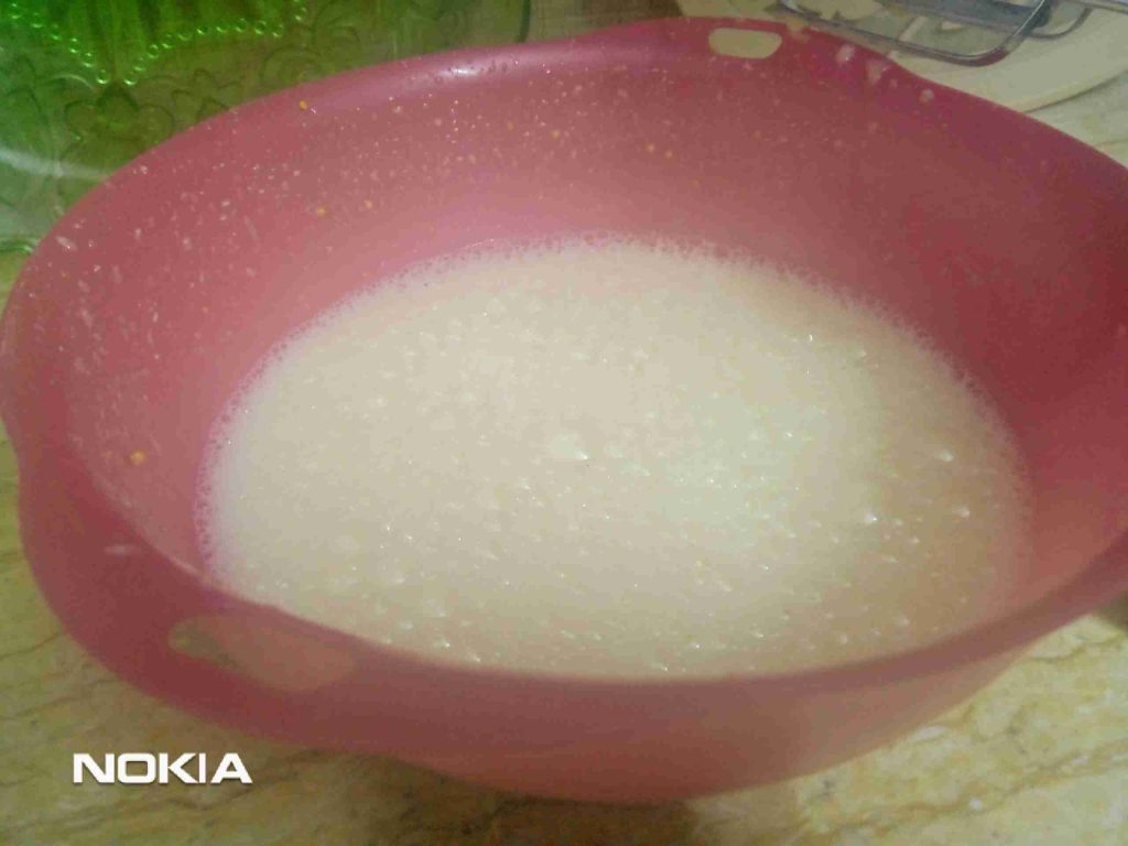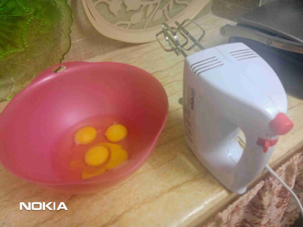 بالبداية بتحتاج لأربع بيضات بالنسبة للبيض لازم يكون بدرجة حرارة الغرفة بنطالعو قبل بساعتين من وقت الاستعمال بنحط البيضات بجاط وبنحط عليها ملعقةصغيرة فانيلا وبنحط ملعقة صغيرة خل ابيض الخل منشان الزنخة وبيعطي طراوة للكيكة وبنخفق البيض اذا بالمضرب اليدوي بالبداية على سرعة واطية وبعدين بنعلي السرعة وبنستمر بخفق البيض لحتا يتغير لون البيض يعني يصير لونو فاتح وبعدين بنضيف السكر وبنستمر بالخفق لحتا يصير لون الخليط كريمي بنضيف كاسة زيت وبنخفق وبضيف كأس حليب دافئ وبنخفق وهيك خلصنا من المواد السائله بنبلش بالمواد الجافة بجاط بننخل كاستين طحين وكاسة نشا وثلاث معالق صغيىرة بكن بودر ونصف ملعقة ملح بنضيف الطحين عالخليط على دفعات حتا نتاكد انو الخليط مابي اي تكتلات بنقلب الخليط مدة دقيقتين وهيك صار الخليط جاهز