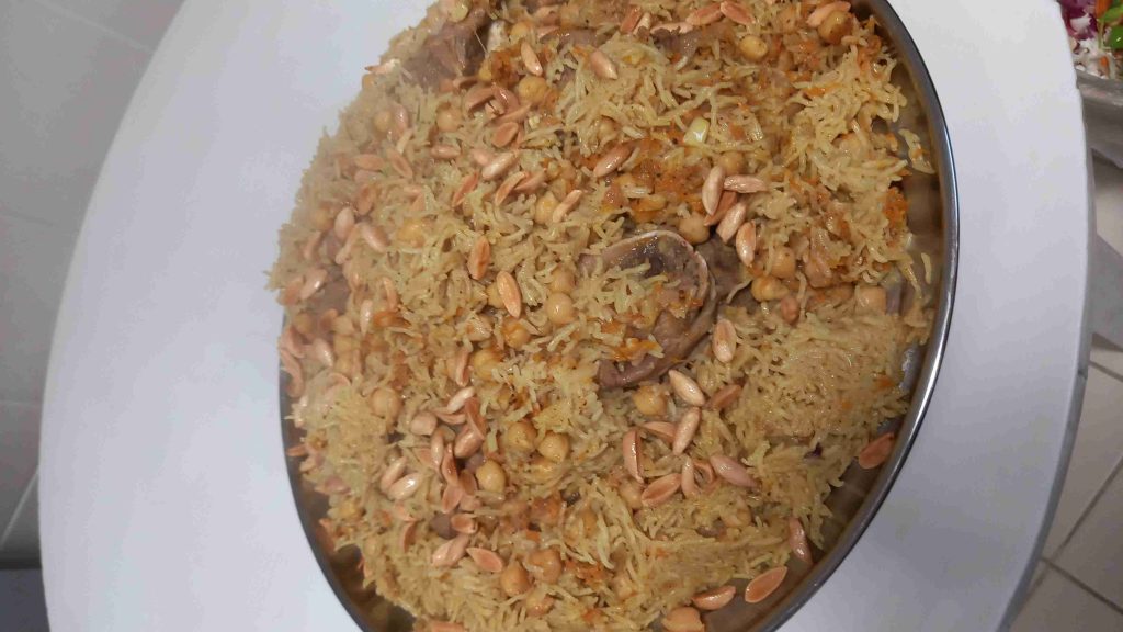 بجيب طنجرة برش رز بعدين من الخلطه وبحط اللحمه وبقيه الخلطه وقرن فلفل حار وباقي الرز برجع بملح وفلفل اسود وبحط عيدان القرفه والبهارات وشويه كاري وبحط مية اللحمه وعالنار حتى تستوي بزينها باللوز وصحتين وعافيه