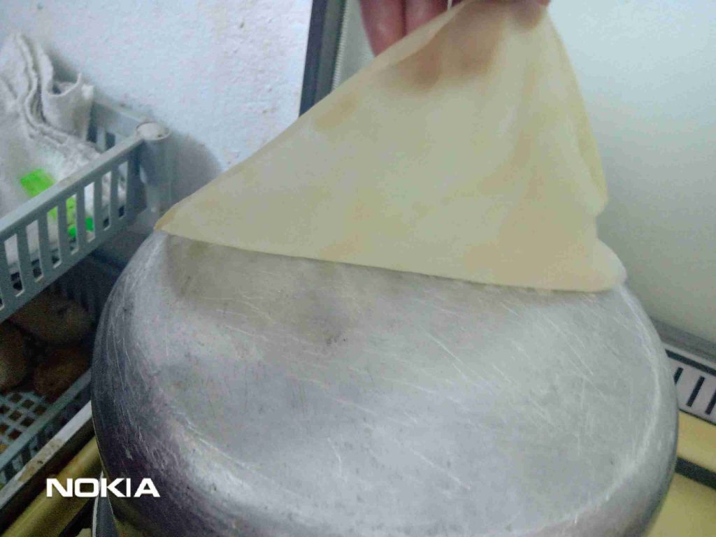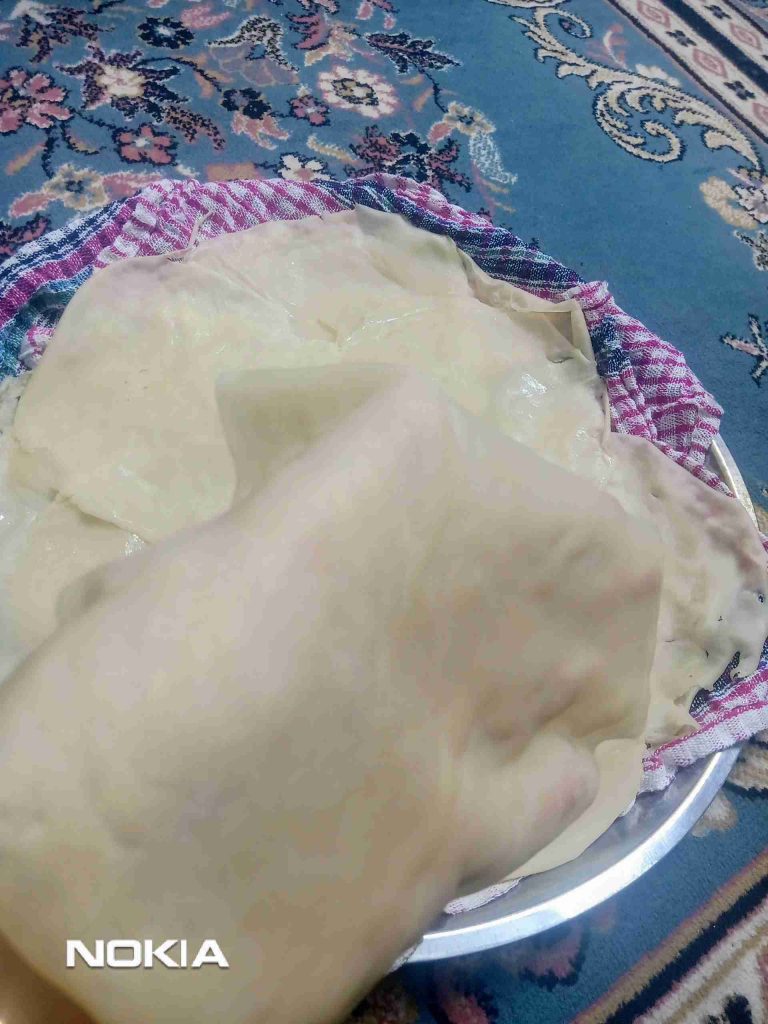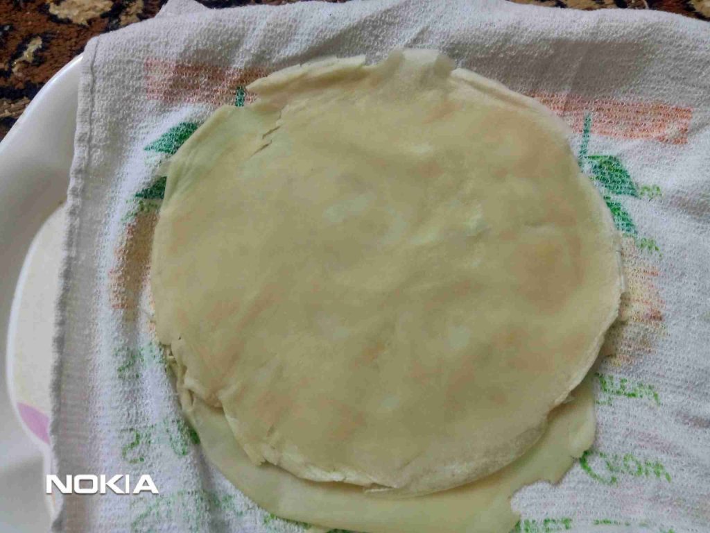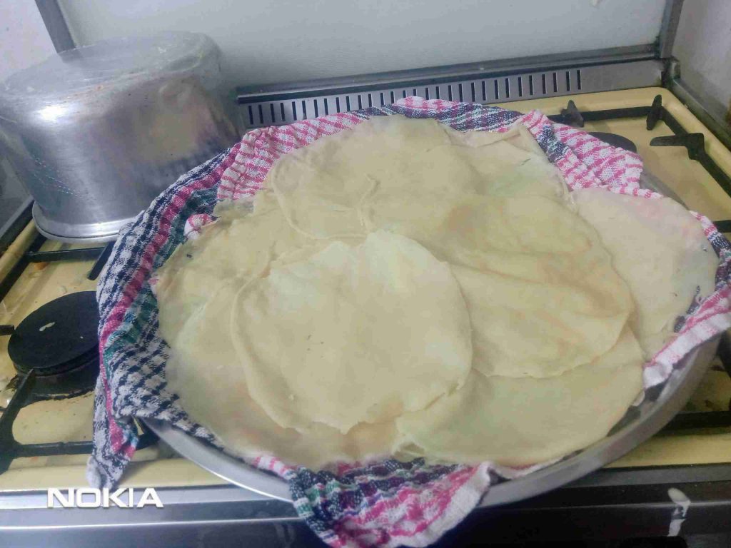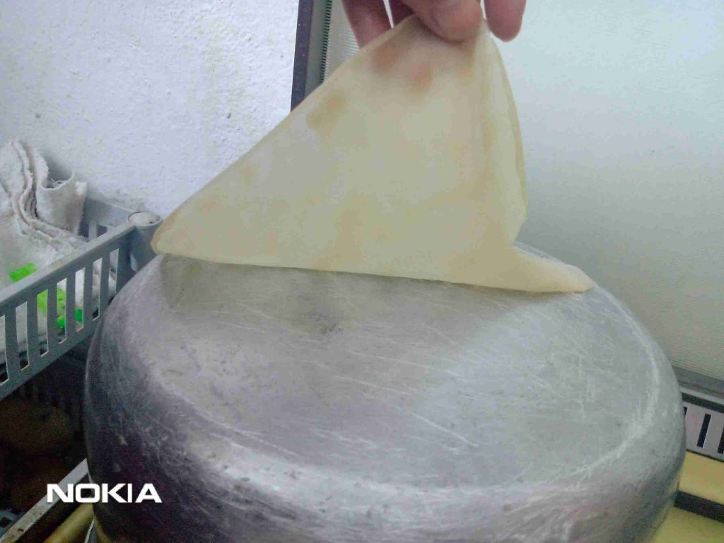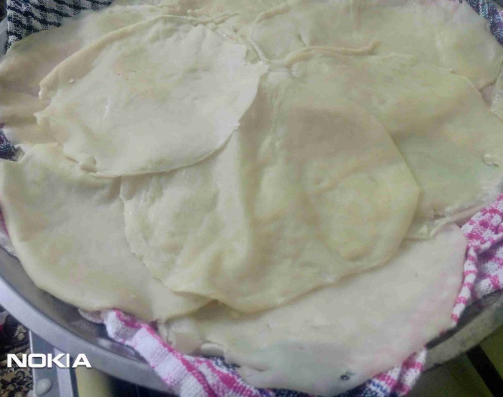حسب استعاب الطحين يمكن ياخذاكثر من اربع كاسات او ياخذ اقل بعد خلط الخليط بنصفي الخليط بمصفاية ناعمة منشان التكتلات وتطلع العجينة ناعمة وبنحط الخليط بوعاء واسع وبنجيب اي طنجرة المنيوم عندك وبنحطها على اصغر عين غاز عندك والنار هادية وبنقلب الطنجرة وبس تسخن بندهن اسفل الطنجرة بمسحة زيت بمنديل وغطست اسفل الطنجرة بالخليط وحطيتها عالغار بدها وقت نصف دقيقة اكثر شوي حسب حرارة الغاز بس مالازم تطول منشان ماتنشف معنا العجينة ونشيلها وهيك لحتا نخلص الكمية وممكن تحشيها بأي حشوة بتحبيها وحطيها باطباق وفرزيها وان شالله يارب تعجبكم وماتنسو تدعولي اذا جربتوها وزبطت معكو وصحة وهنا