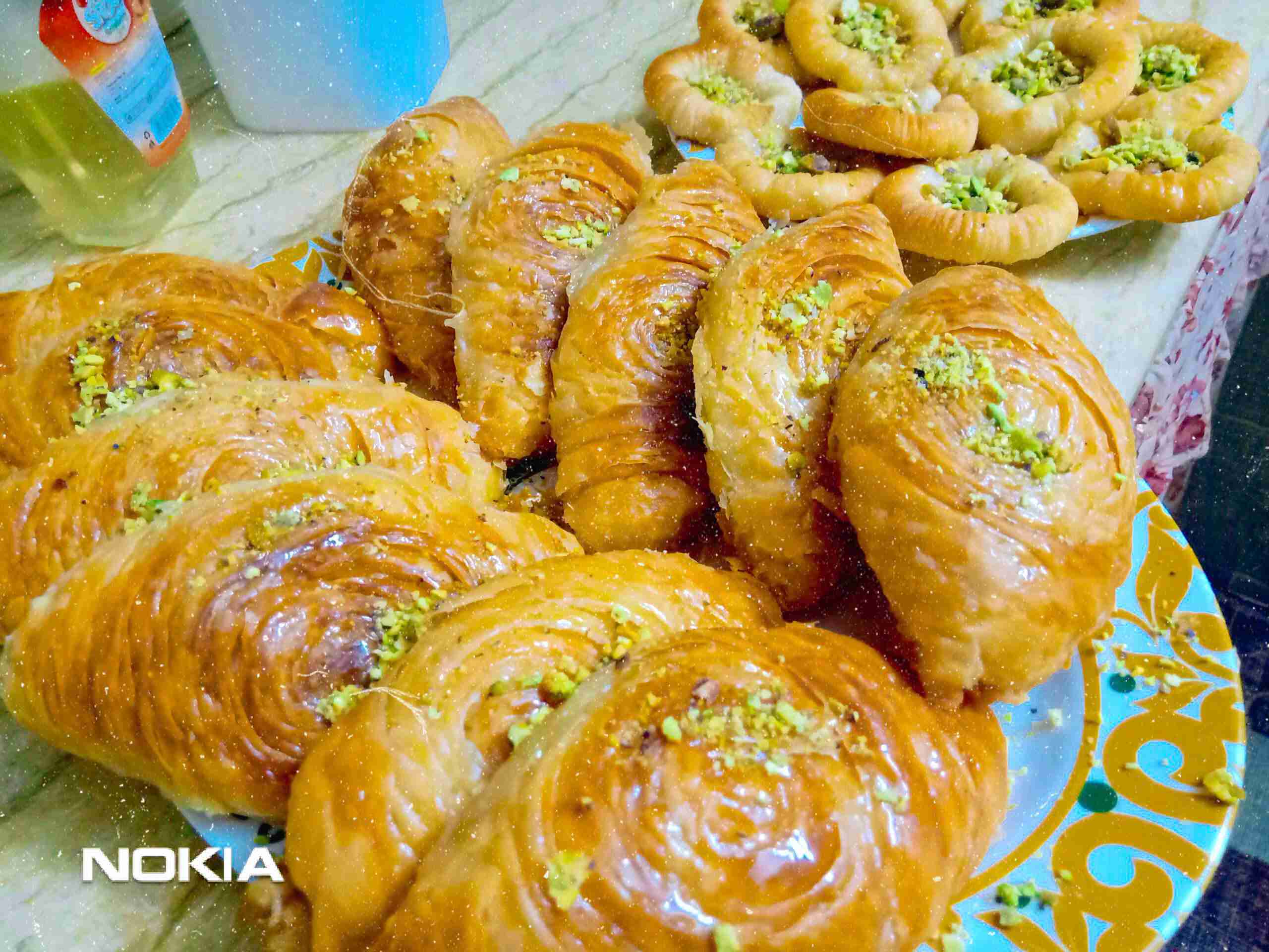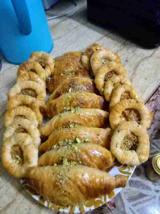 نغطيها بالنايلون حتى لاتنشف ونتركها ترتاح ربع ساعة تقريباً ثم نبدأ بفرد كل قطعة بالنشابة ( من دون نشا )فرد خفيف ونضع الحشوة و نشكلها حسب الرغبة