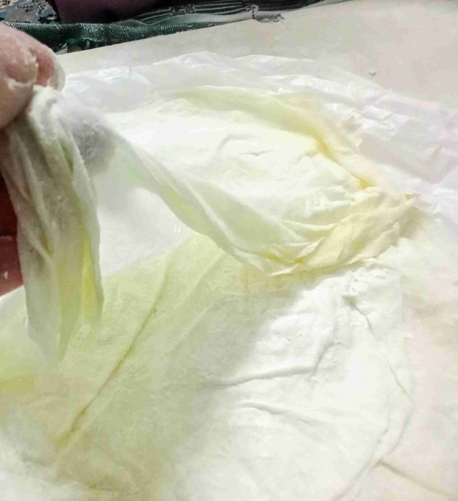 نعجنها جيداً حتى نحصل على عجينة ملساء لاتلتصق باليد ( إن وجدتِ العجينة جافة ممكن إضافة ملعقتين أو ٣ ملاعق من الماء ع حسب نوع الدقيق واستيعابه للسوائل ) نتركها ترتاح لمدة ٢ – ٣ ساعات ع الأقل