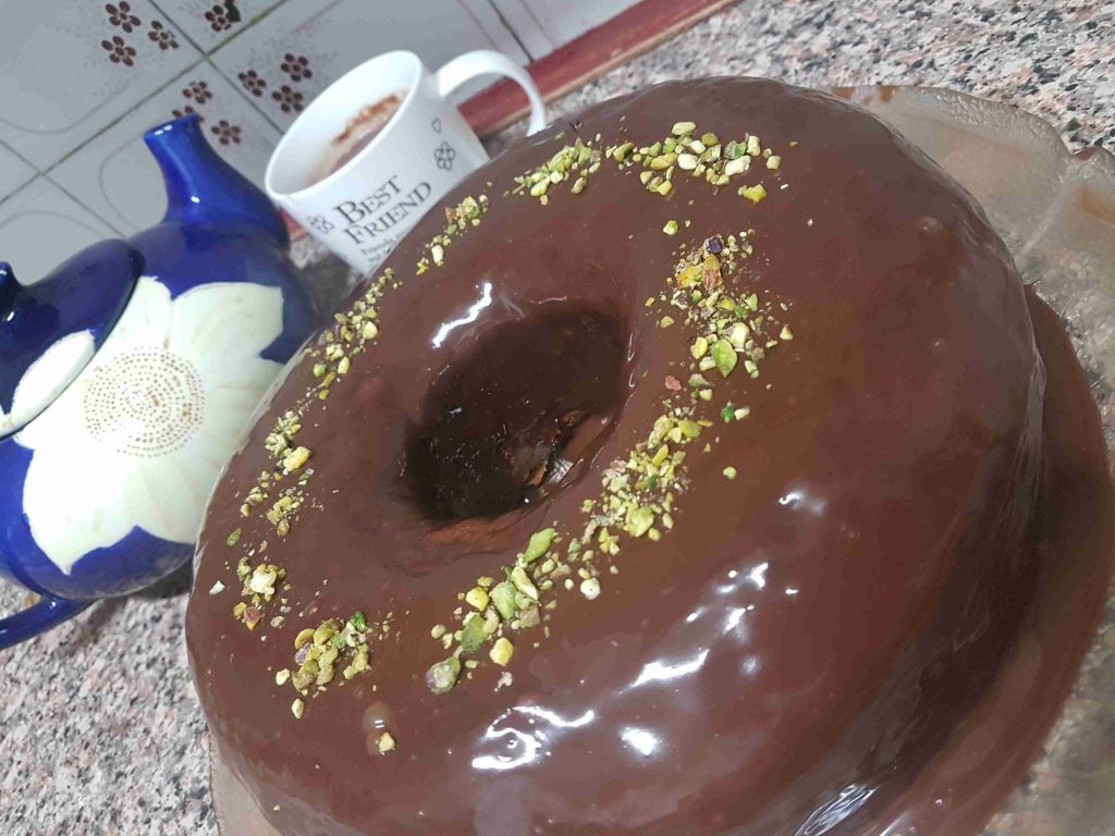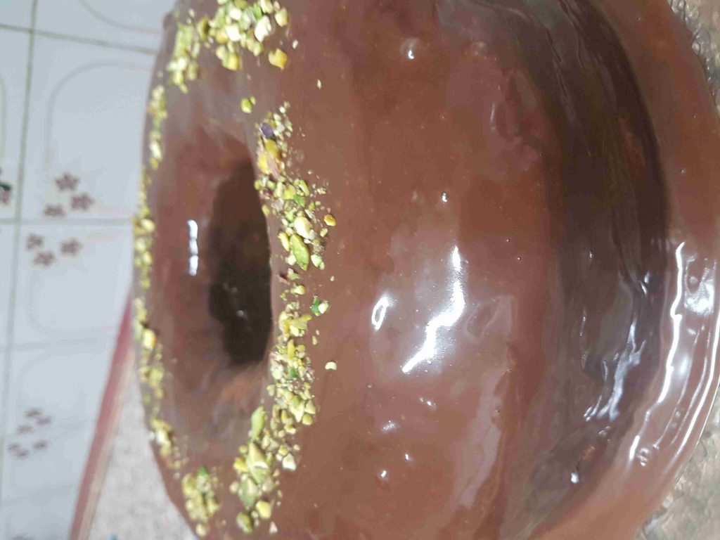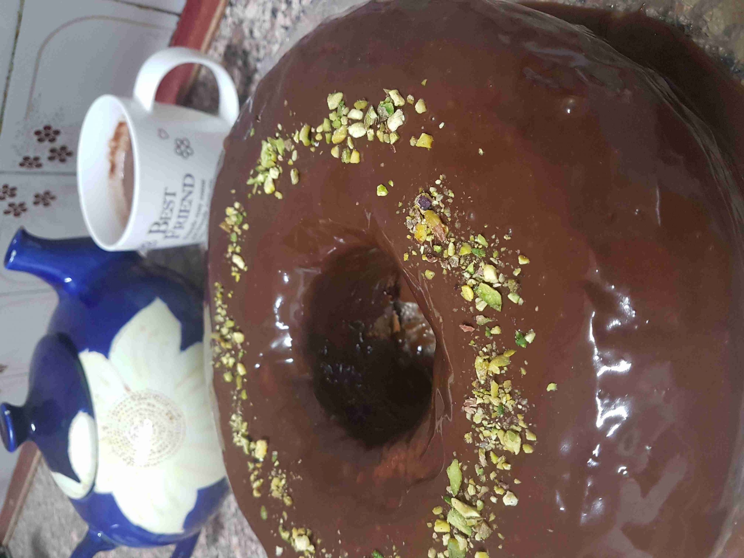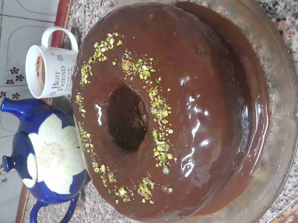 خلط البيض مع الفانيلا بعدين السكر نخلط لحتى يتغير لون البيض نضع الزيت ونخلط ونضع الحليب ونخلط ونضع الطحين والكاكاو والبيكنج باودر المنخولين ونخلط ومعلقه النوتيلا نحضر القالب وندهنه بقليل من الزيت ورشه طحين ونضع الخليط ونضعه في الفرن محمي مسبقا على درجه حراره ١٨٠ لمده ساعه إلا ربع او حسب فرنك وبس تبرد شوي نضع خليط النوتيلا ويزين بالفستق الحلبي
