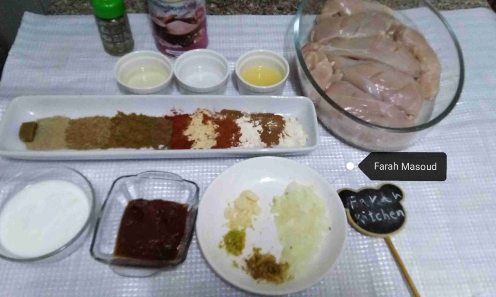 بتبليهم لمدة ليلة كاملة بعدها بمقلاة عليها اربع ملاعق كبيرة زيت حامية بتنزلي صدور الدجاج ليتحمروا من الجهتين بعدها بتقطعيهم وبتدخليهم فرن حامي ليستوا بعدها بتحطيلها صحن قصدير عليه زيت و بتنزلي عليه فحمة سخنة اختياري