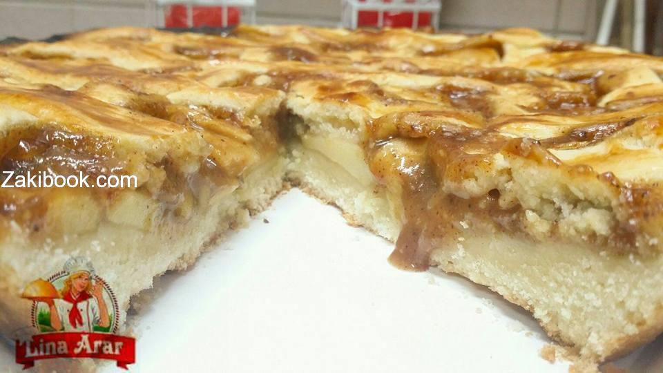 نفرد العجينة بشكل متراص ثم نضع خليط التفاح ثم نقطع العجين المتبقي بشكل طولي ويفرد على قطعة مدهونة بالزيت ويزين وتدهن عجينة الزينة بصفار البيض يوضع بالفرن حتى تحمر الاطراف ثم يحمر من الاعلى وبالعافية