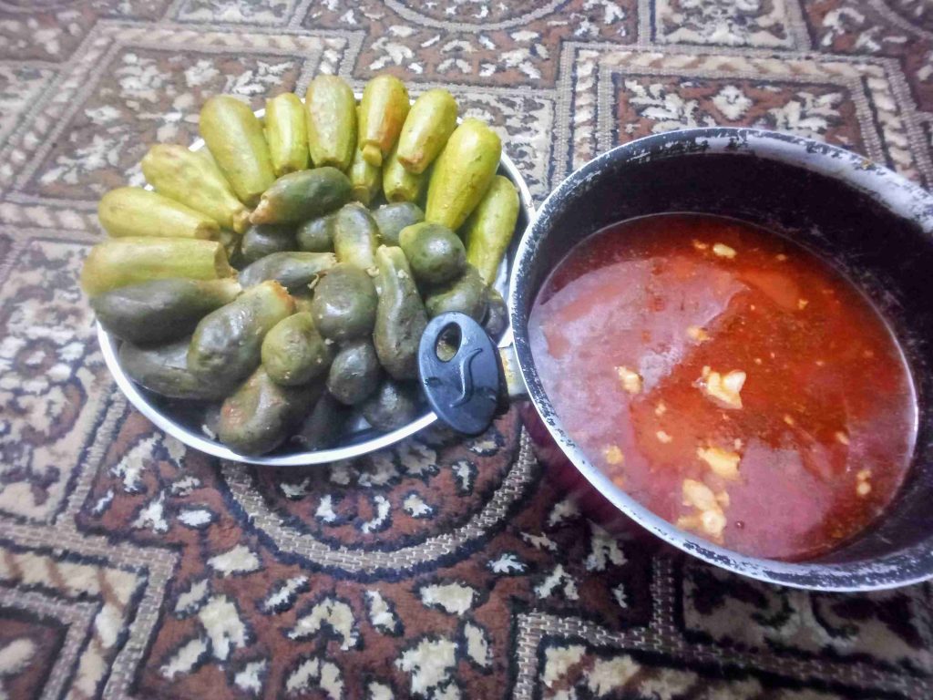 أول خطوة بنحفر الكوسا والباذنجان وبنغسلهم بمي وبنقلبهم حتا تصفا منهن المي وثاني خطوة بنغسل البندورة وبنقطها قطع صغيرة وبنضيف عليها الملح ونمرسها بايدينا وبعد بنحضر الحشوة بنغسل الرز بمي سخنة وبنضيف عليها السمنة بتعطي لمعة ونكهة طيبة للرز وبنضيف اللحمة والملح والفلفل الأسود وبنضيف عليها من مية البندورة وبخلطها مليح وبنحشيها بنصفها بالطنجرة وبضيف عليها كاستين ماء ساخن وبحطها عالغاز ولتركها تغلي ثم بصفي البندورة بمصفاة ناعمة وبحطها عالغاز ويتركها تغلي وبضيفها للمحاشي وبضيف عليها الثوم وبنغطيها ويتركها قبل ما تستوي بسوي بضيف النعنع اليابس وبتركهن يغلو شوي