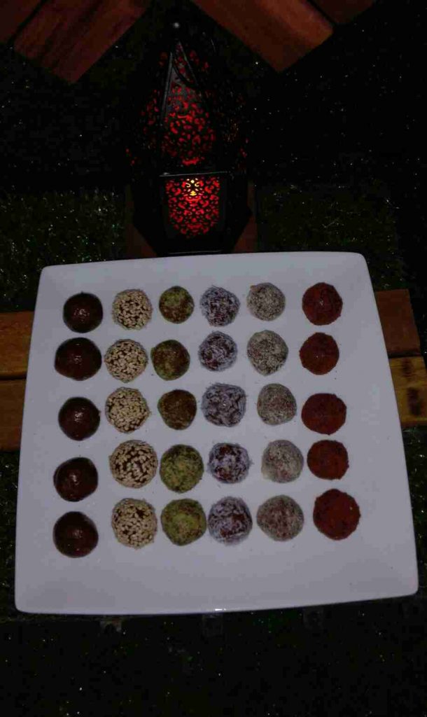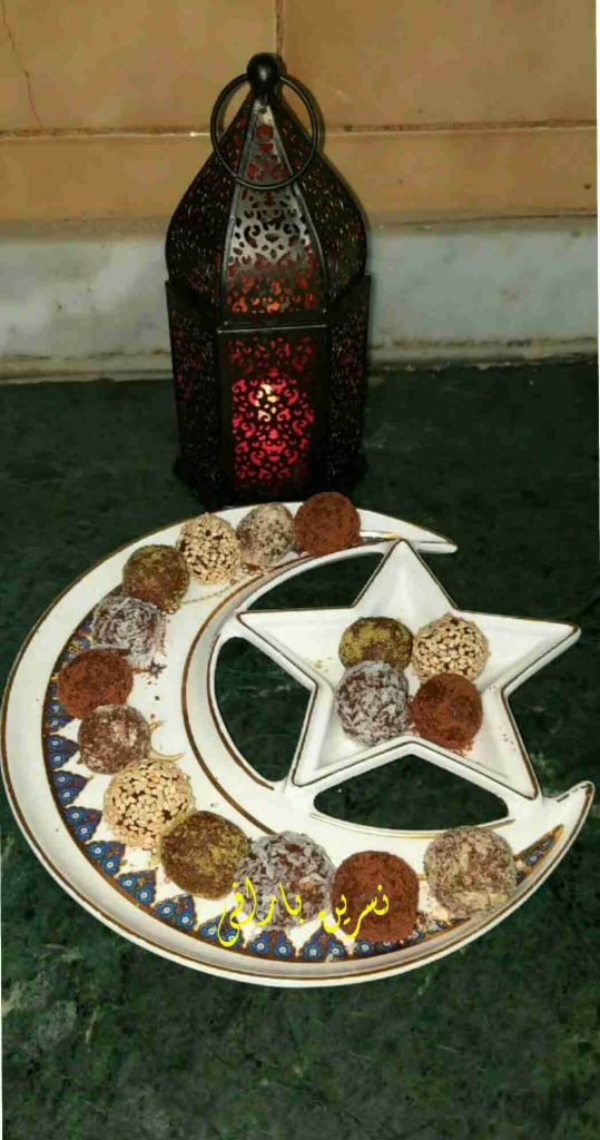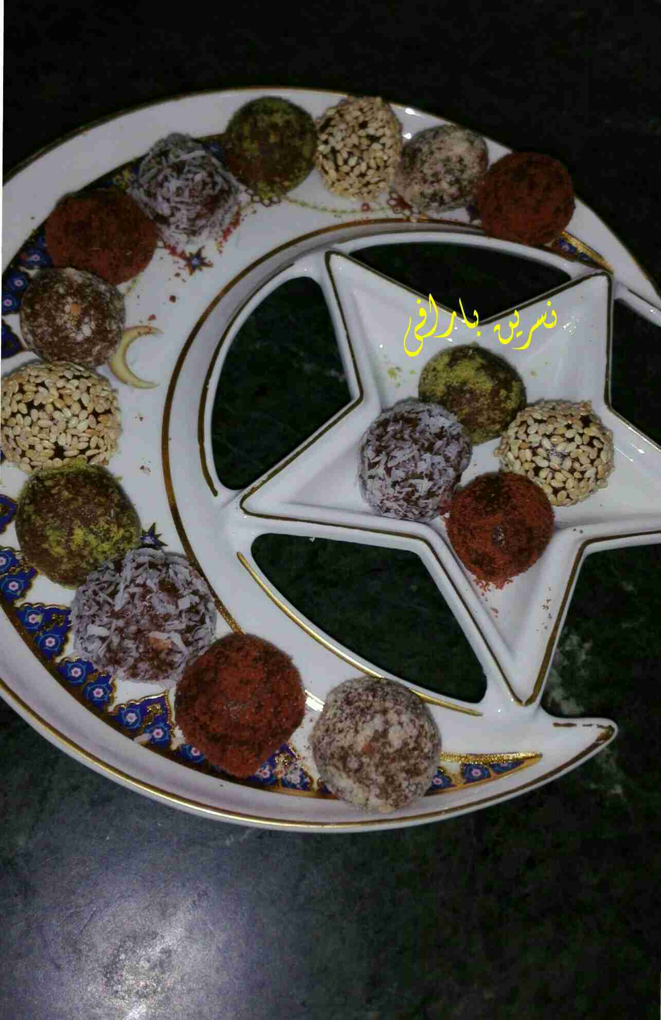 نضيف كل المكونات وندعكهم جيداً ونضعهم ربع ساعة بالثلاجة ثم نخرجهم ونكورهم ونغمسهم بالكورن فليكس او بالبسكوت المطحون السادة او بسكوت شوكولا او جوز هند او فستق حلبي مطحون او سمسم حسب الرغبة وتقدم الف صحة وهنا