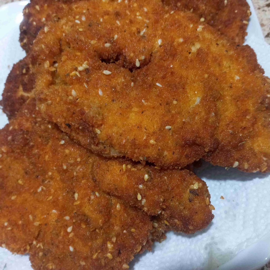 نقطع صدر الدجاج للحجم الي بتحبو نغسلهم نضعهم في وعاء ونضع البهارات والملح والخل ونتركهم لمدة ساعه بعدين نضع الطحين في وعاء نضع عليه الملح والبهارات ونضع البيضه في وعاء اخر ونرش شوية بهار عليه والبقصمات في وعاء اخر نضع قطع الدجاج في الطحين وبعدين في البيض وبعدين في البقصمات ونضعها في الفريزر لمدة ساعه او اكتر وبعدي نحمي الزيت للقلي ونقلي لزم يكون الزيت حامي والدجاج مغمر فيه ونقلبهم على الجهتين لتوصلو للون الي بتحبو