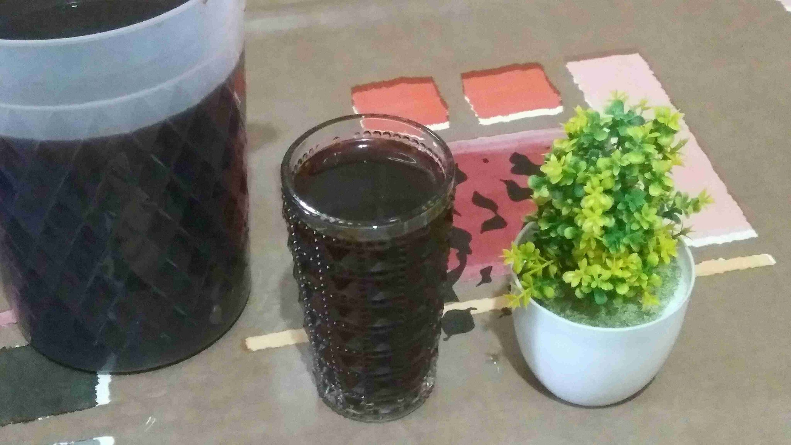 ويكرر التصفيه اكتر من مرة حتى ما يكون فيو شوائب وإذا كان ثقيل بزيدو مي وبضيف السكر حسب الرغبة
