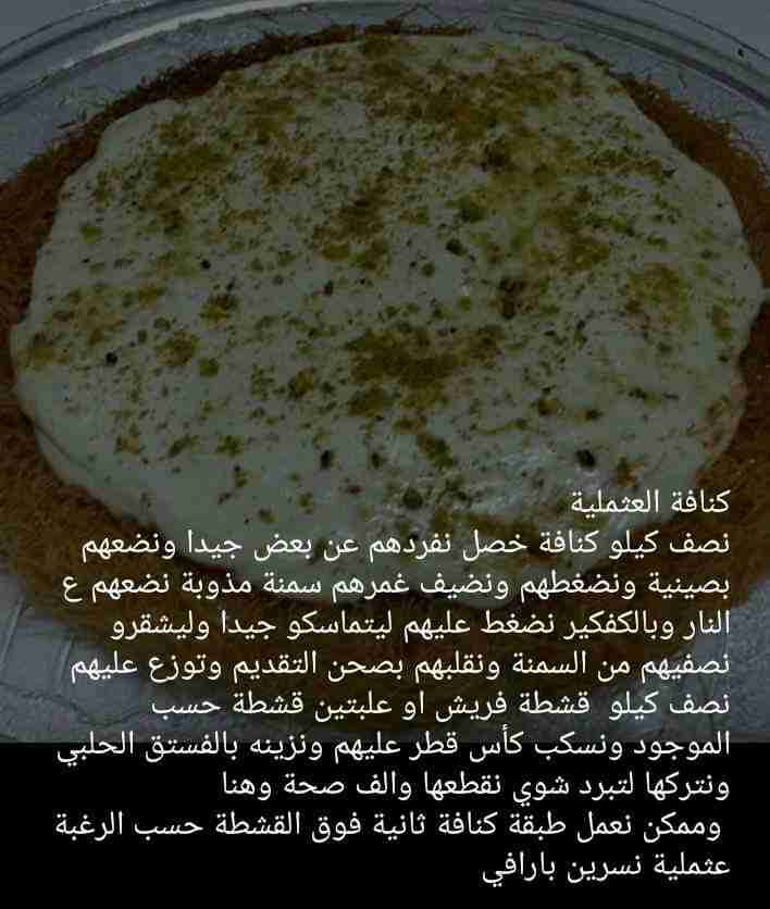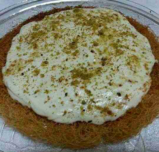 نصف كيلو كنافة خصل نفردهم عن بعض جيدا ونضعهم بصينية ونضغطهم ونضيف غمرهم سمنة مذوبة نضعهم ع النار وبالكفكير نضغط عليهم ليتماسكو جيدا وليشقرو نصفيهم من السمنة ونقلبهم بصحن التقديم وتوزع عليهم نصف كيلو قشطة فريش او علبتين قشطة حسب الموجود ونسكب كأس قطر عليهم ونزينه بالفستق الحلبي ونتركها لتبرد شوي نقطعها والف صحة وهنا