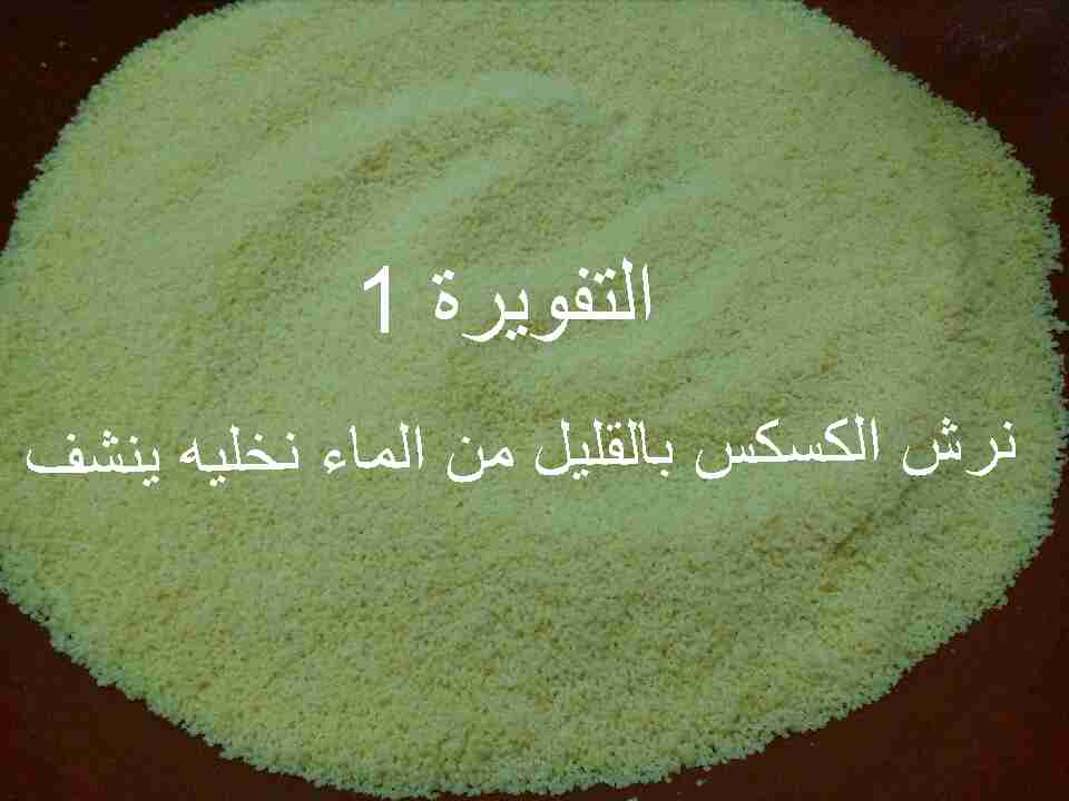 في قصعة نرش الكسكس بالقليل من الماء، نخلط جيدا و نتركه يتشرب. في التفويرة الأولى ما نكثر ماء حرصا على ان لا يتعجن لينا الكسكس، نرش فقط رشات بإيدينا ونخلط، و نطبخه على البخار 20دقيقة.