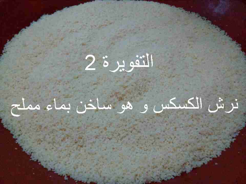 نزيل الكسكس من البخار و هو ساخن نرشه بكأس كبير ماء مذاب فيه ملح حسب كمية الكسكس و ذوقكم، و نخليه يبرد و يتشرب و نرجعه على البخار مدة 20دقيقة يتفور تفويرة 2.