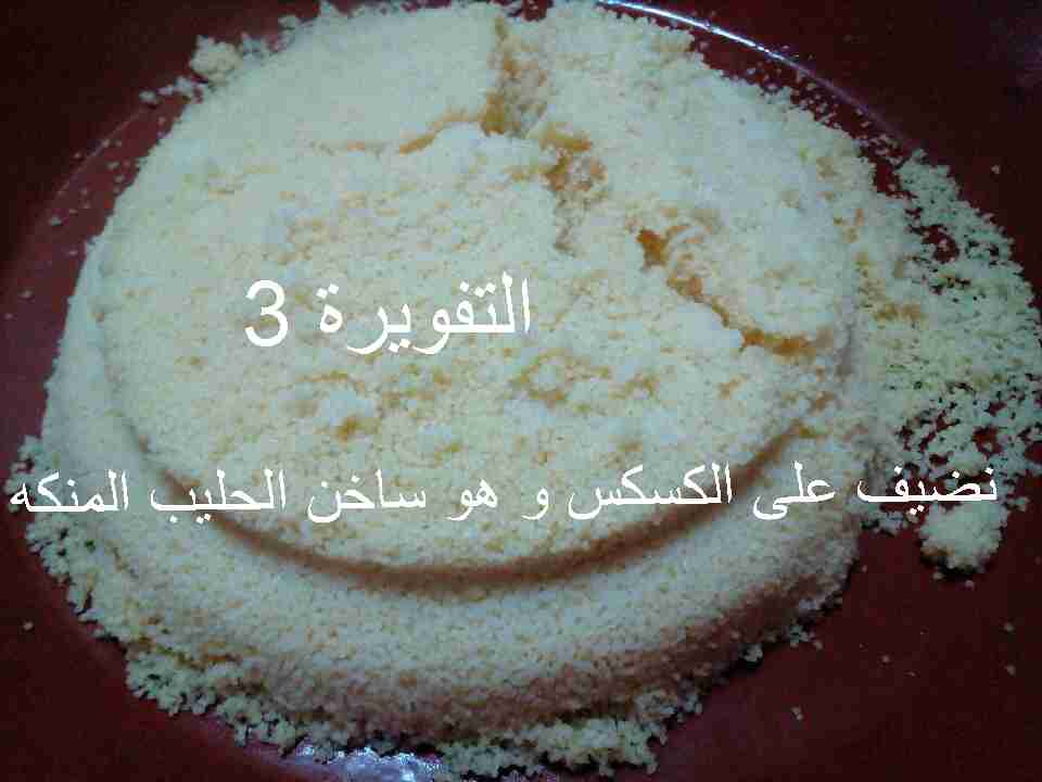 نزيل الكسكس من البخار و هو ساخن نصب الحليب و نخلط حتى تتشرب كل حبات الكسكس بالحليب، و نتركه حتى يبرد مع التقليب مرة مرة و نرجعه يفور تفويرة أخيرة مدة 20دقيقة، و نخلطه و هو ساخن بمعجون الزبيب و الزبدة و بودرة اللوز نضيف العسل حسب الذوق و القرفة حسب الذوق و نخلط الكل جيدا و نقدم السفة مزينة بفواكه جافة محشية واللوز المطحون و قرفة مطحونة و العسل مرفوقة بحليب بارد منكه بماء زهر.
