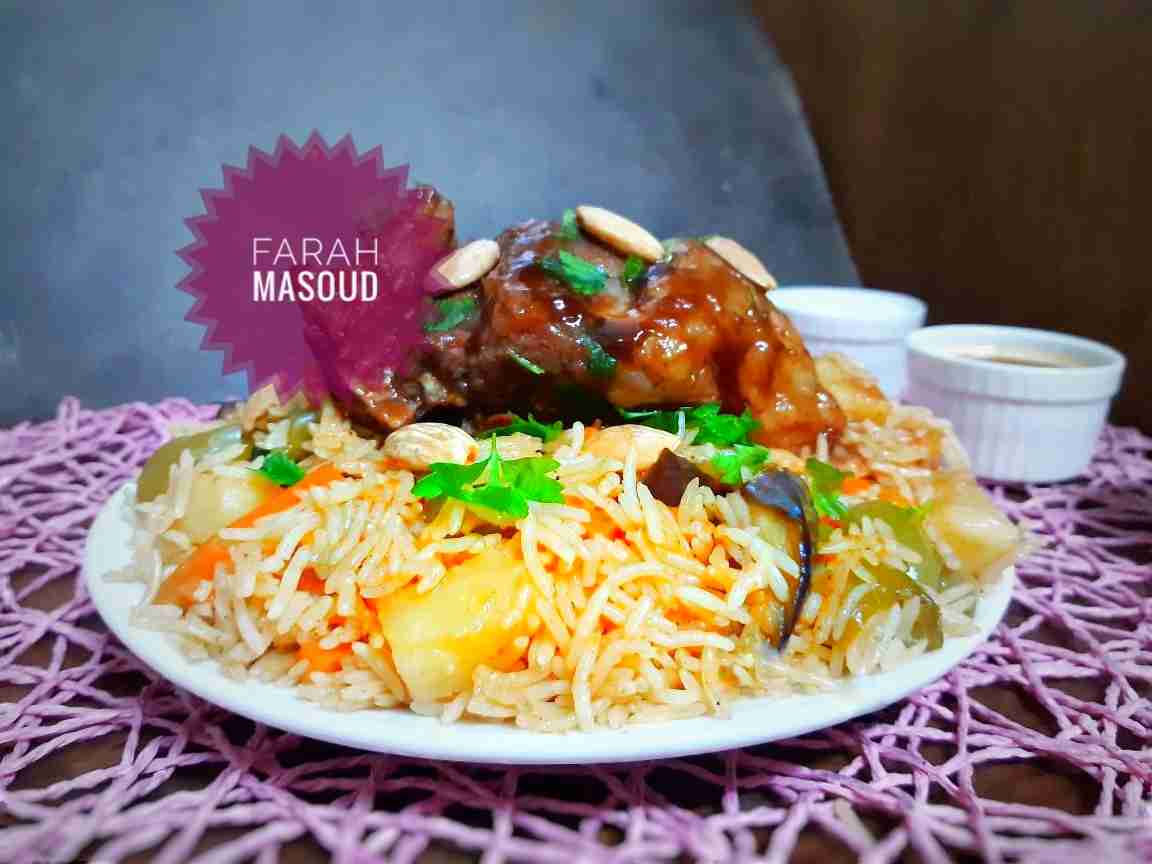 للحمة بتخلطي مكونات التتبيلة وبعد ماتنسلق بتدهنيها وبتدخليها الفرن وبعدها بتحطيلها صحن قصدير عليه زيت و فحمة