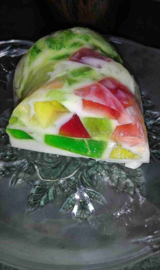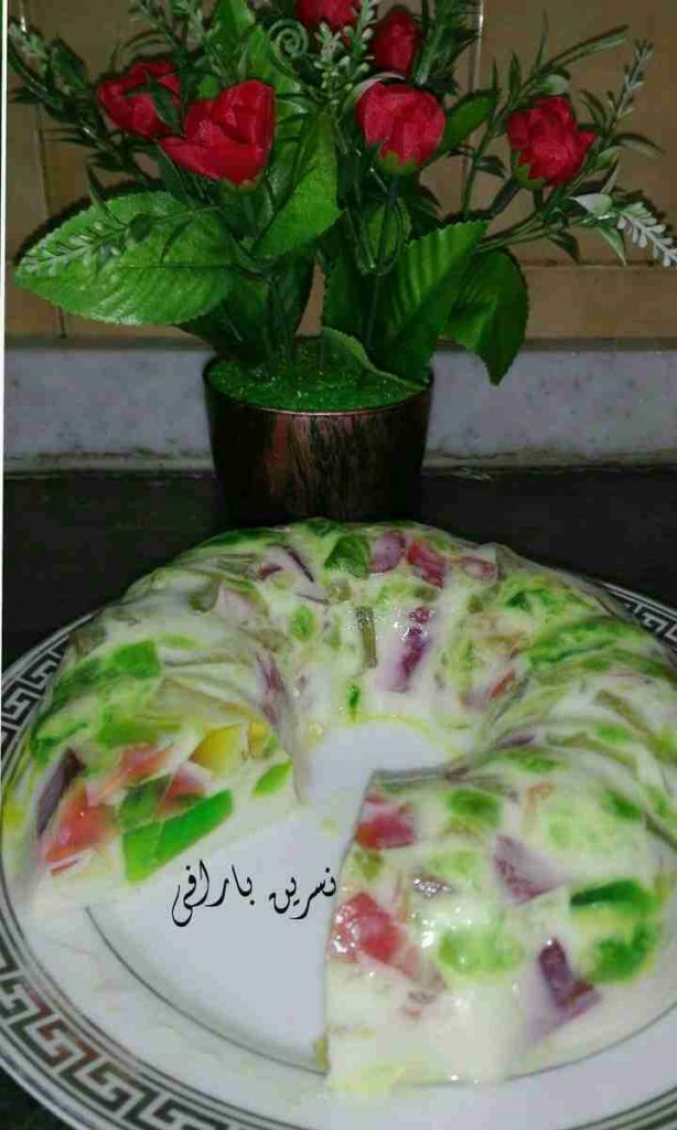 نضع كل ظرف جيلي بجاط بايركس صغير او علبة بلاستيك ونضيف كأس ماء ساخن عليه ندوبه ثم نضعهم بالثلاجة ليبردو تماما نطلعهم ونقطعهم مكعبات صغيرة وبخفة ونخلطهم ونرجعهم الثلاجة ونجهز الطبقة الثانية نضع الحليب بالطنجرة ونضيف عليه السكر ليدوب ويبلش بالغليان نضيف القشطة ونحرك باستمرار لتختفي نضيف الدريم ويب نحركهم ليمتزجوا نطفي تحتهم ونجهز ثلاث ارباع الكأس المغلي ونضع بقلبه ٣ملاعق كبيرة جيلاتين ونحركهم بخفة ونضيفهم فوق الحليب نحركهم جيدا ونتركهم ليبردو بحرارة الغرفة ثم نجيب قالب كيك وندهنه بقليل من الزيت جيدا ونضع الجيلي البارد ونوزعه بالوانه ثم نسكب مزيج الحليب فوقه وع الثلاجة مدة ٤ساعات اقل شئ ثم نطلعه ونضعه مدة ثانيتين بوعاء فيه قليل من الماء الساخن ثم نقلبه بصحن التقديم والف صحة