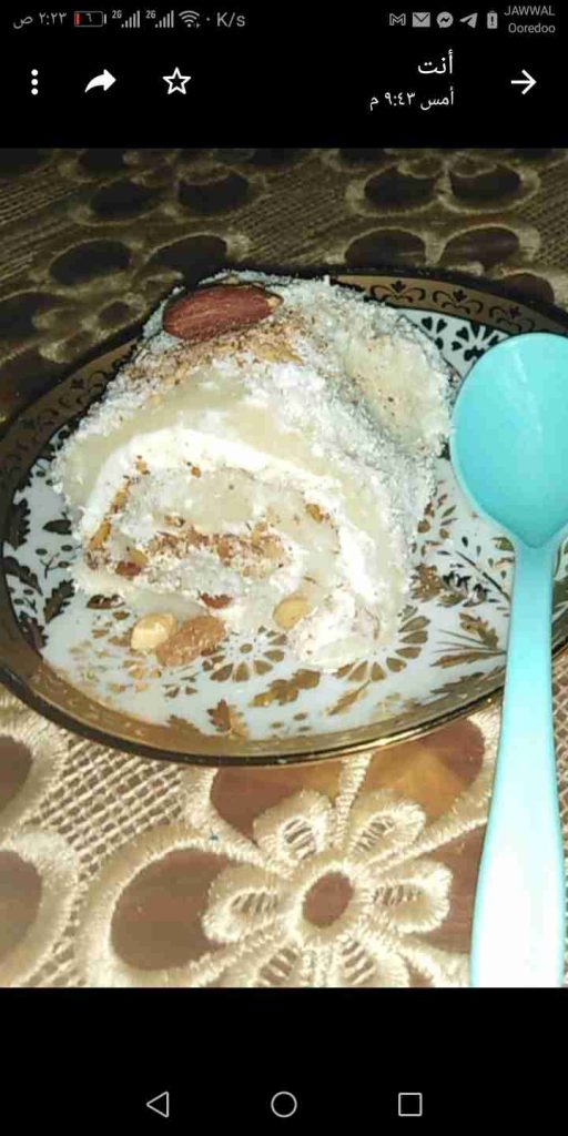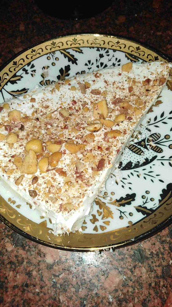 نخرج الطبق وندهن الكريمة فوقه ونرش المكسرات وندخلها الثلاجة مرة اخري.