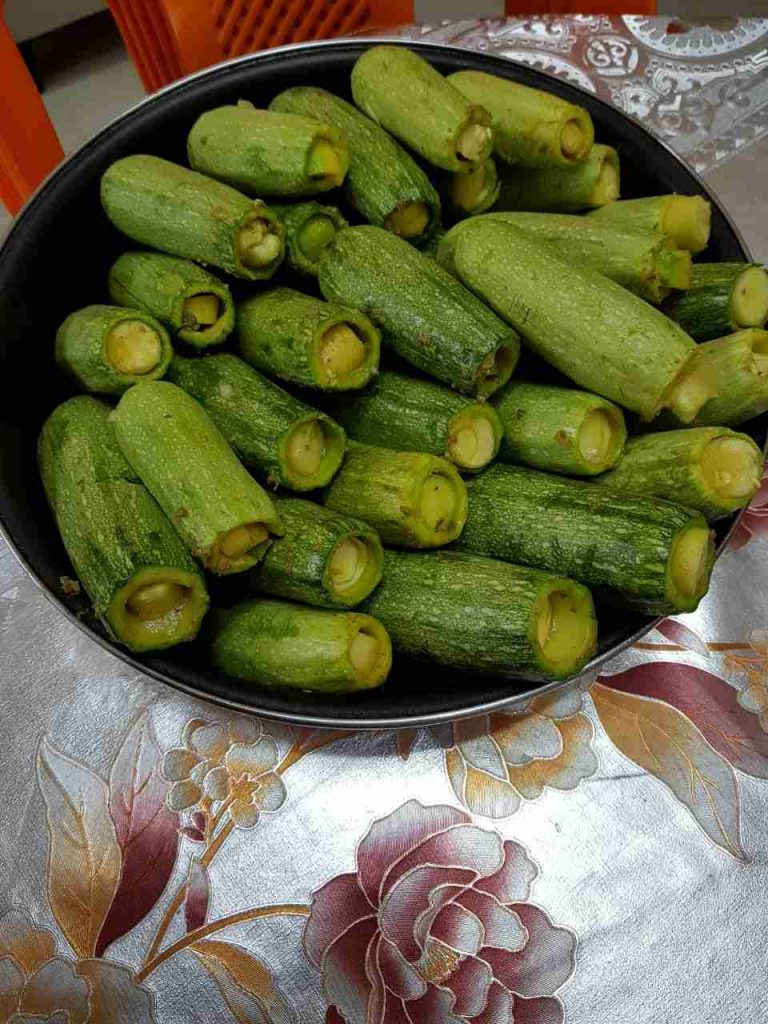 نحشي الكوسا بخلطة الرز ونقفل الكوسا بقطع بطاطا.