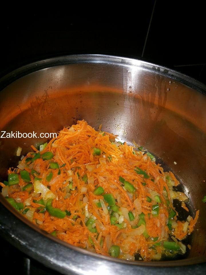 في طنجرة يذبل البصل المفروم ناعما والثوم والجزر المبروش والفلفل الحلو والحار وتضاف البندورة المفرومة ناعما + ملعقتين صلصة بندورة مع بهارات الكبسة الناعمة