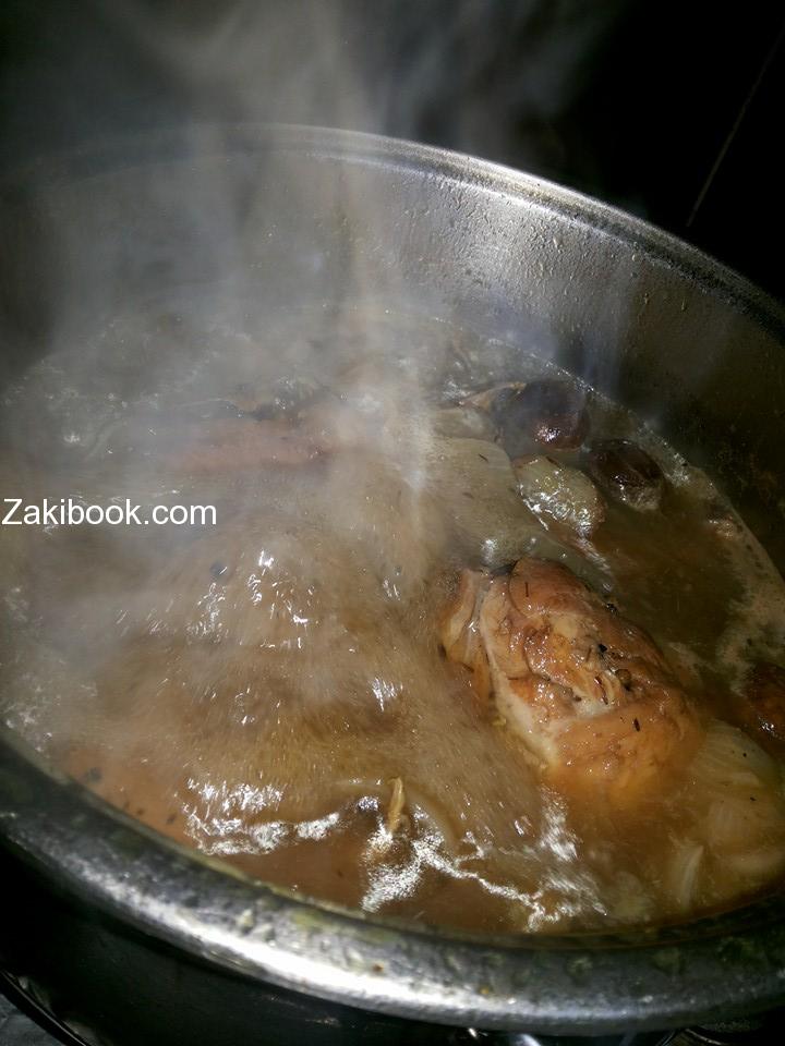 يضاف الأرز المنقوع مسبقا ومرق سلق الدجاج بعد تصفيته ويترك حتى يستوي الأرز