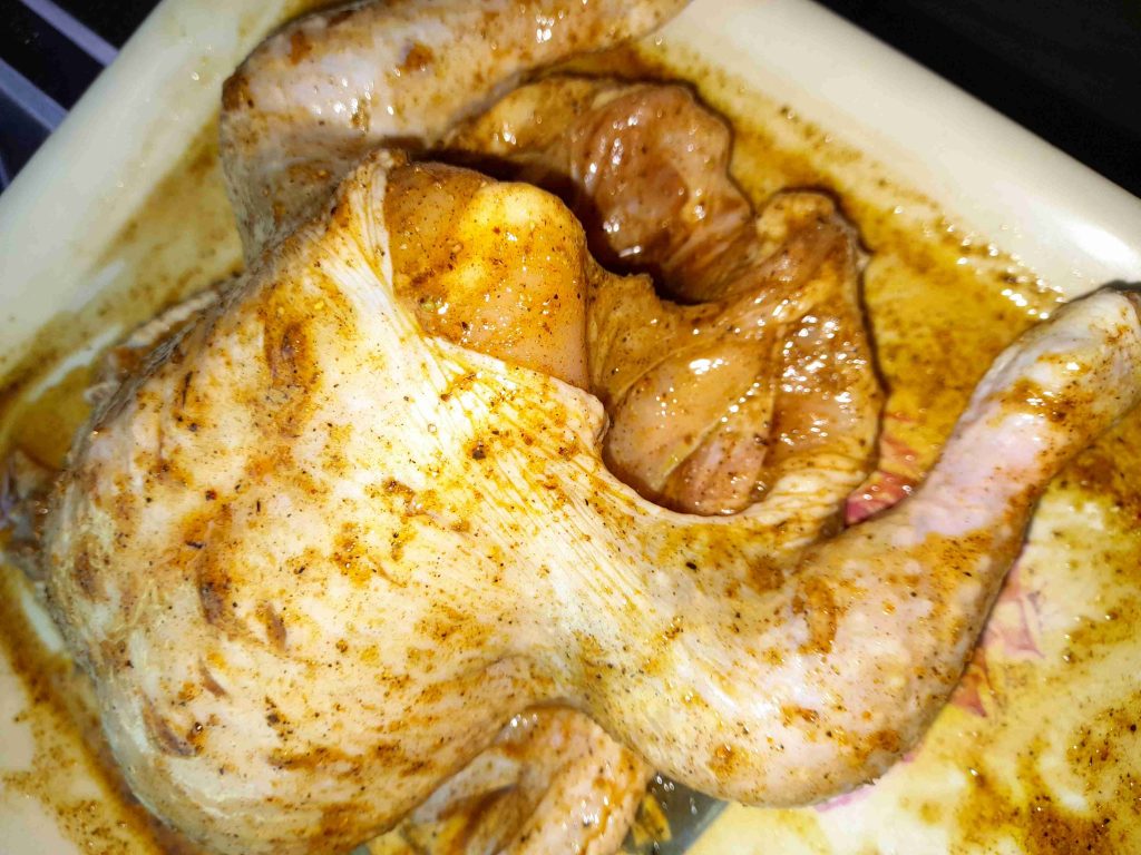 ٤-رابع اشي بنجيب الدجاجه المنقوعه بالبهارات وبندهنا من الوجه بخلطه حسب الرغبه انا دهنتها بصويا صوص مع باربكيو ودبس الرمان والملح والكاتشاب وزيت الذره واعطو لون بجنن وطعم زاكي