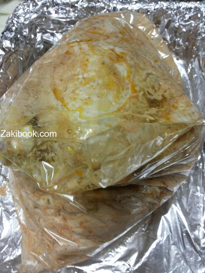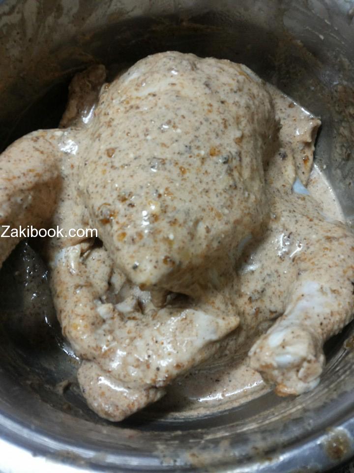 تتبل الدجاجة قبل بليلة بالملح والخل وصلصة البندورة واللبن وزيت الزيتون وجميع البهارات