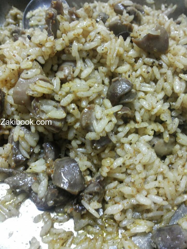 يسلق الرز نص سلقة ويحوس مع اللحمة المفرومة أو القوانص المفرومة ويتبل بالبهارات