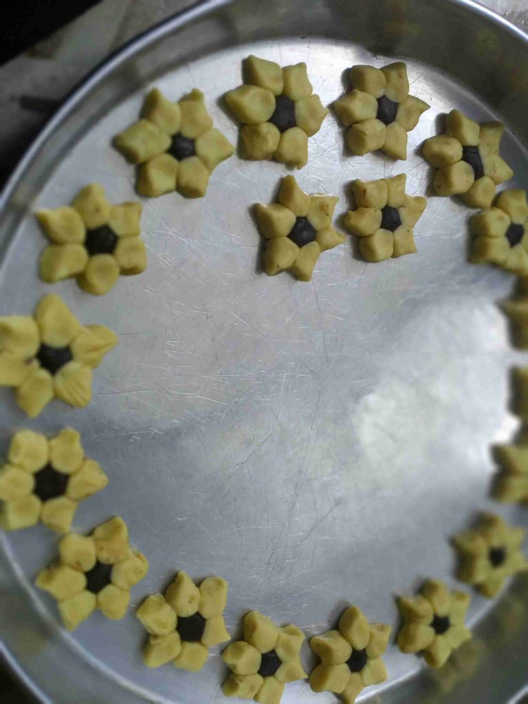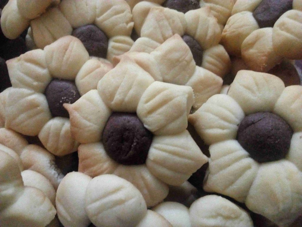 وبنضيف ملعقة كبيرة كاكاو بودرة وبنعجنها بأطراف الأصابع وبنغطيها وبنتركها نص ساعة بالثلاجة بنأخذ قسم من العجينة وبنعمل كرات صغار بنحط كرة باللون الاسود فى الوسط و٦مرات باللون الابيض حولها وبجمعهن مع بعض نرسم بالسكين خطوط على كل كرة وبندخللن على فرن حامي ١٨٠ درجة الحرارة مدة ١٥دقيقة تقريبا حسب حرارة الفرن النار من الأسفل واخر دقيقتين من الاعلى مع المراقبة وهيك صارو جاهزين والف صحة وهنا