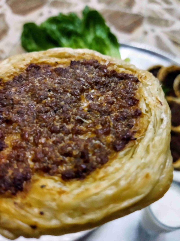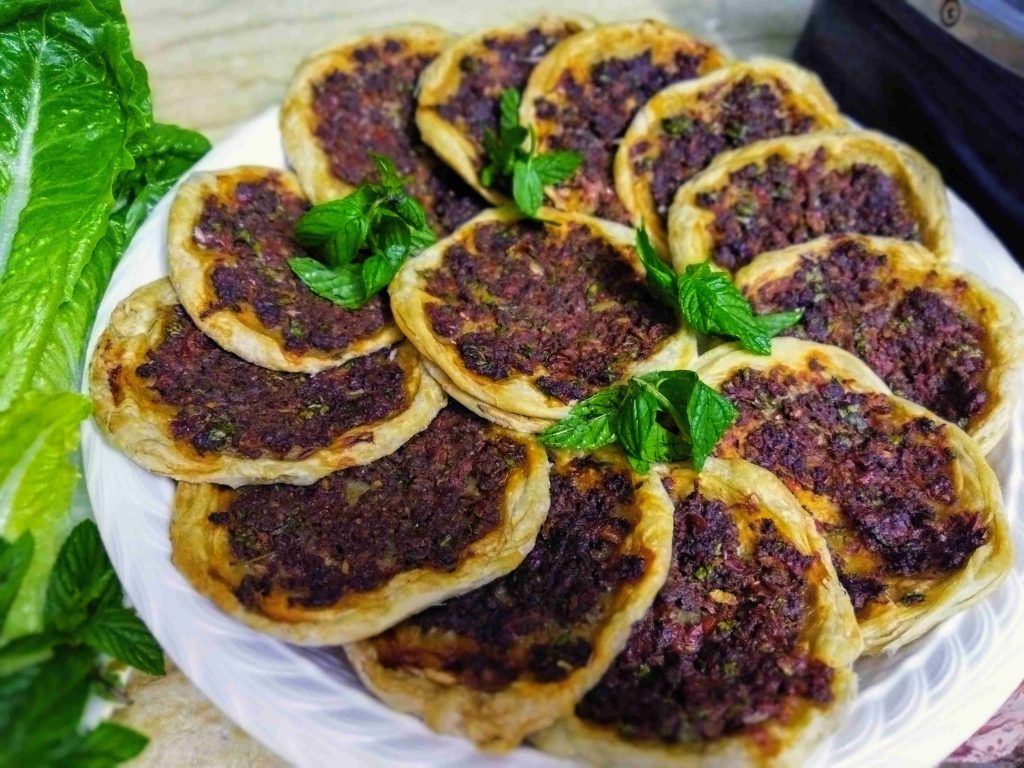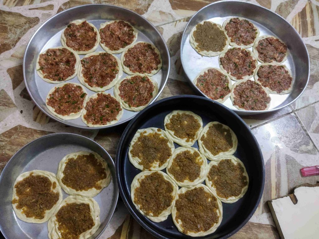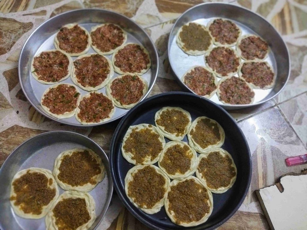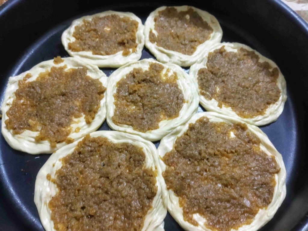 يسعد اوقاتكم اليوم رح نعمل أكلة حلبية تقليدية تقدم بالمناسبات والافراح ورح نعملها بالدجاج واللحم وان شالله تكون الطريقة سهلة اول مرحلة بنزل اربع اكواب طحين وبنضيف عليهن ملعقة صغيرة ملح وربع كوب زيت وربع ملعقة كربونات الصوديوم وبنضيف الماء وبنعجن اخذت معي العجينة كاس ونص حسب استيعاب العجين لحتا تصير عجينة طرية مابتلزق باليد ونتركها ترتاح نص ساعة اهم شي بنجاح التوريق للعجينة انو انريحها بكل مرحلة بعد ماترتاح العجينة بنلفها على شكل رول ونتركها ترتاح نص ساعة وبعدين بنقطعها ثلاث قطع على شكل دائري ونتركها ترتاح نص ساعة بواسطة شوبك بنرقها على شكل دائري وبندهن وجه الدائرة بالزبدة والسمنة يلي خلطناهن مع بعض حتا تورق العجينة بكمية وفيرة ونتركها ترتاح نص ساعة حسب ماتكون ارتاحت العجينة لانو إذا ماارتاحت العجينة مابتساعدنا بالمد بنبلش نمسك بأيد وبنشد برياحة وبالايد الثانية بنلف العجينة مثل طريقة توريق الشعبيات بالسمنة بنلفهن على شكل رول وبنتركهن يرتاحو نص ساعة بنقطعها قطع حسب الرغبة وبنحطن بالطينية وبنمد بأيدينا أو بالشوبك على شكل دوائر وبنحشين بالحشوات يلي حضرناهن مسبقا خلطة اللحمة مكونة من اللحمة ثلاث حبات بندورة مفرومة ناعم ونص ملعقة ثوم مهروس وملعقة صغيرة ملح ونص ملعقة فلفل مطحون وملعقة كبيرة دبس فليفلة وملعقة كبيرة دبس رمان وبقدونس ونعناع مفرومين ناعم وبنضيفن عالحمة وبنحركن مع بعض وخلطة الدجاج بيلزمنا الدجاج المفروم ناعم بنضيف عليه بصلتين مفرومين ناعم ونص كأس دبس رمان وملعقة ملح صغيرة ونص ملعقة فلفل اسود مطحون وبنحلطهن مع بعض وبنتركهن مدة ساعة تتشرب التوابل وبنحط بمصفاية لحتا نصفي ألمي منن ونبلش ندهن كرات العجين بالحشوات وبندخلهن فرن حامي مسبقا على درجة ٦ ميتين لحتا تتحمر من الاسفل بنحطها على الشبك الوسط بالفرن وبنحمر الوجه وهيك صارو جاهزين ويتمنى تعجبكم وصحة وهنا