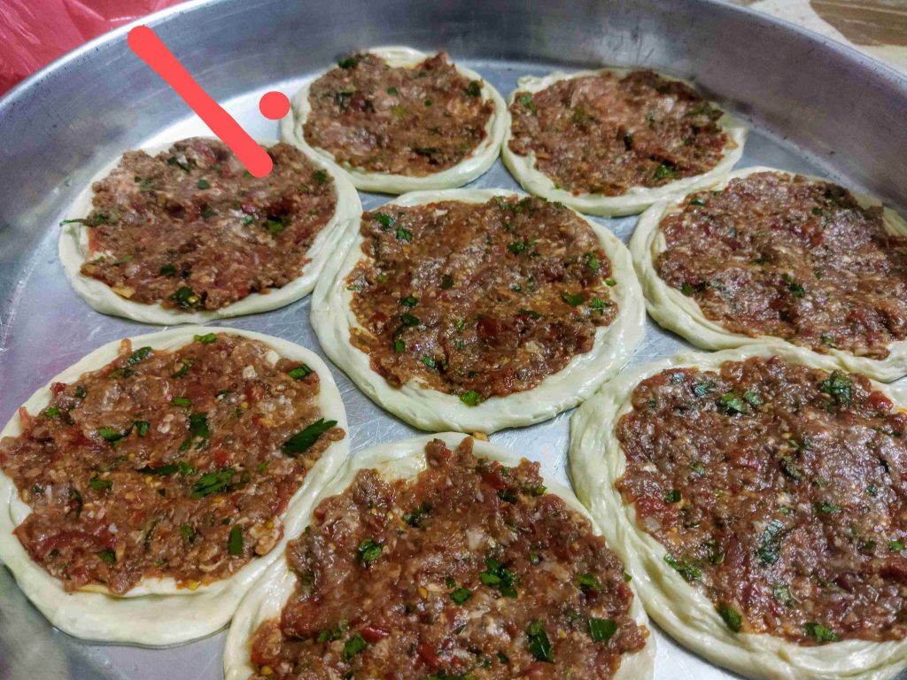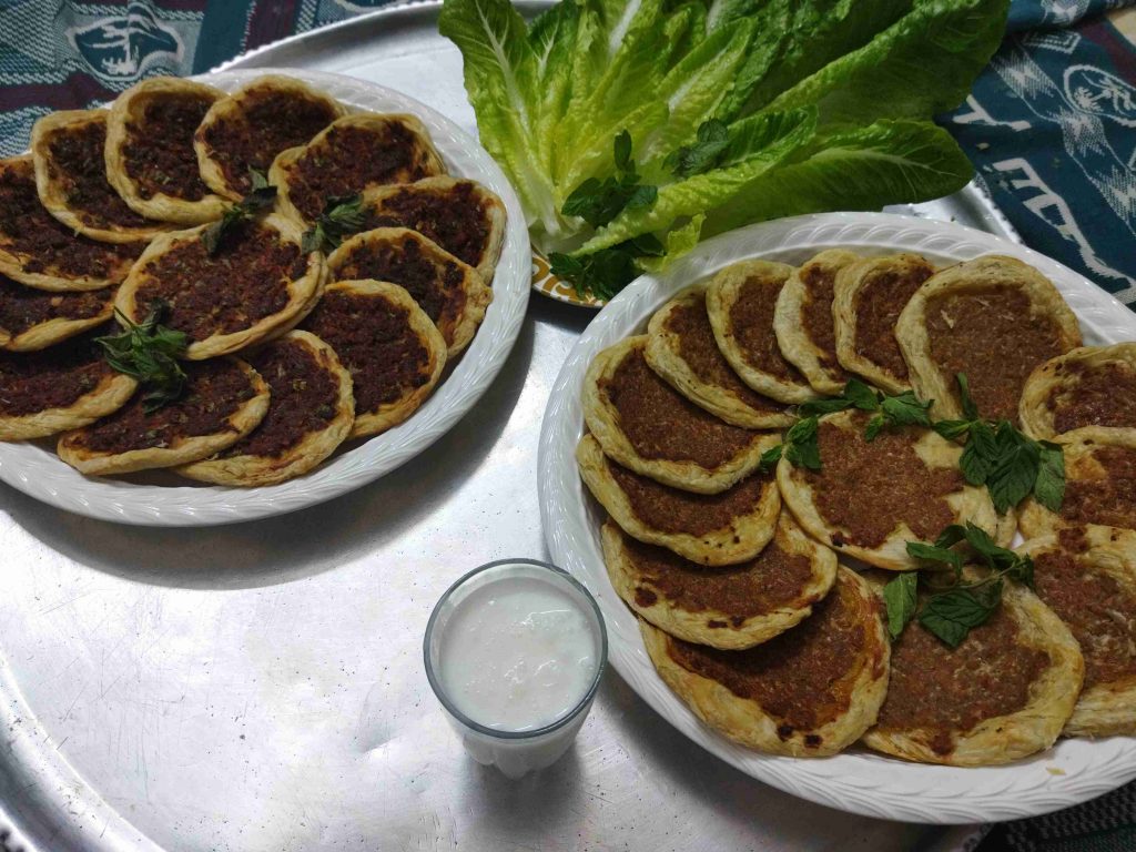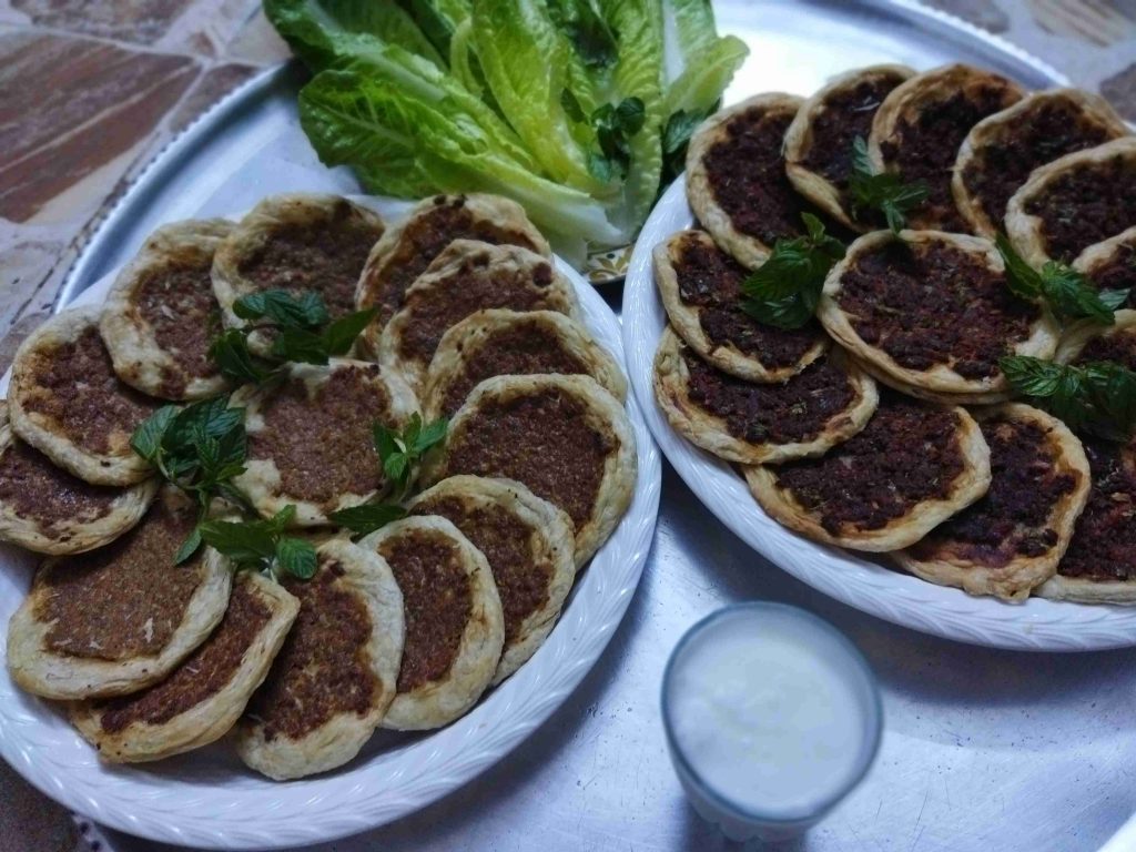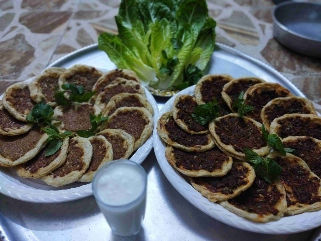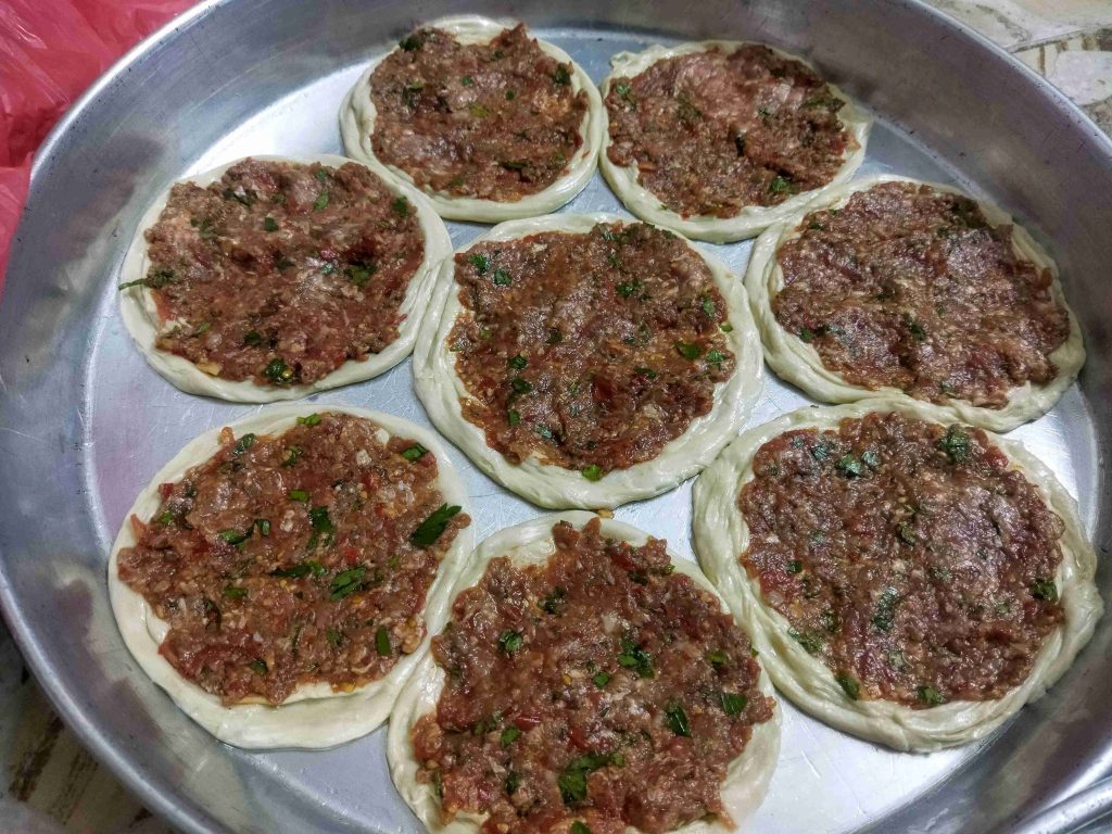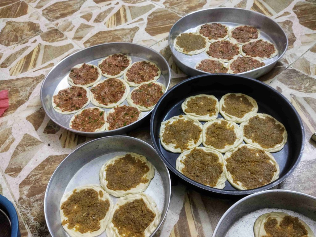 يسعد اوقاتكم اليوم رح نعمل أكلة حلبية تقليدية تقدم بالمناسبات والافراح ورح نعملها بالدجاج واللحم وان شالله تكون الطريقة سهلة اول مرحلة بنزل اربع اكواب طحين وبنضيف عليهن ملعقة صغيرة ملح وربع كوب زيت وربع ملعقة كربونات الصوديوم وبنضيف الماء وبنعجن اخذت معي العجينة كاس ونص حسب استيعاب العجين لحتا تصير عجينة طرية مابتلزق باليد ونتركها ترتاح نص ساعة اهم شي بنجاح التوريق للعجينة انو انريحها بكل مرحلة بعد ماترتاح العجينة بنلفها على شكل رول ونتركها ترتاح نص ساعة وبعدين بنقطعها ثلاث قطع على شكل دائري ونتركها ترتاح نص ساعة بواسطة شوبك بنرقها على شكل دائري وبندهن وجه الدائرة بالزبدة والسمنة يلي خلطناهن مع بعض حتا تورق العجينة بكمية وفيرة ونتركها ترتاح نص ساعة حسب ماتكون ارتاحت العجينة لانو إذا ماارتاحت العجينة مابتساعدنا بالمد بنبلش نمسك بأيد وبنشد برياحة وبالايد الثانية بنلف العجينة مثل طريقة توريق الشعبيات بالسمنة بنلفهن على شكل رول وبنتركهن يرتاحو نص ساعة بنقطعها قطع حسب الرغبة وبنحطن بالطينية وبنمد بأيدينا أو بالشوبك على شكل دوائر وبنحشين بالحشوات يلي حضرناهن مسبقا خلطة اللحمة مكونة من اللحمة ثلاث حبات بندورة مفرومة ناعم ونص ملعقة ثوم مهروس وملعقة صغيرة ملح ونص ملعقة فلفل مطحون وملعقة كبيرة دبس فليفلة وملعقة كبيرة دبس رمان وبقدونس ونعناع مفرومين ناعم وبنضيفن عالحمة وبنحركن مع بعض وخلطة الدجاج بيلزمنا الدجاج المفروم ناعم بنضيف عليه بصلتين مفرومين ناعم ونص كأس دبس رمان وملعقة ملح صغيرة ونص ملعقة فلفل اسود مطحون وبنحلطهن مع بعض وبنتركهن مدة ساعة تتشرب التوابل وبنحط بمصفاية لحتا نصفي ألمي منن ونبلش ندهن كرات العجين بالحشوات وبندخلهن فرن حامي مسبقا على درجة ٦ ميتين لحتا تتحمر من الاسفل بنحطها على الشبك الوسط بالفرن وبنحمر الوجه وهيك صارو جاهزين ويتمنى تعجبكم وصحة وهنا