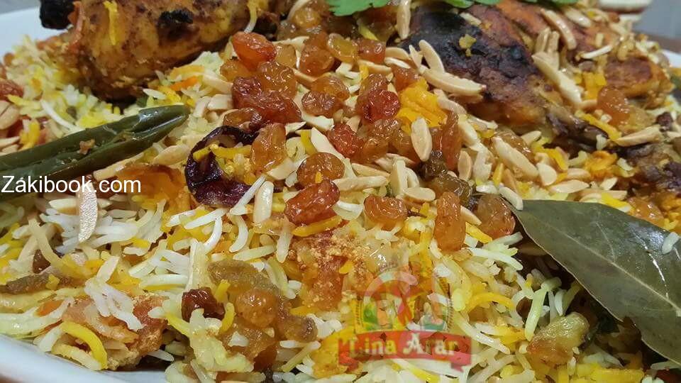 بنصفي الارز وبنحط بالطنجرة نصف كمية الارز ثم الجاج ثم الخلطة ثم باقي الارز ونحط ملونات طعام ثم الكزبرة ثم البصل المقلي ونغطي الطنجرة وننتظر حتى استواء الارز ثم يقدم وبزين بالمكسرات وبالعافية