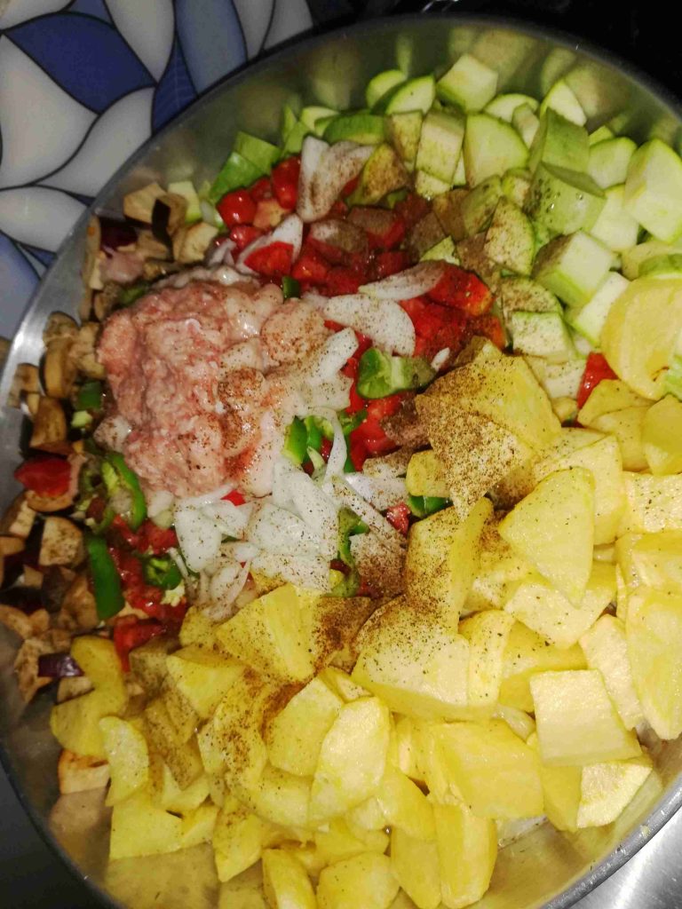 في الخطوة الثانية، نقوم بإحضار وعاء كبير الحجم ونخلط جميع المكونات السابقة {كالباذنجان والفليفلة والبصل والكوسا والبطاطا واللحمة والبندورة} ومن ثم نمزجهم مع بعضهم في الوعاء.