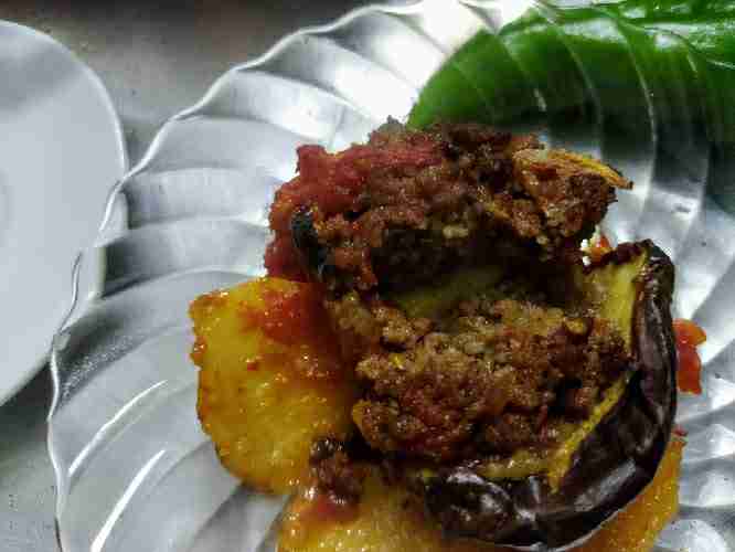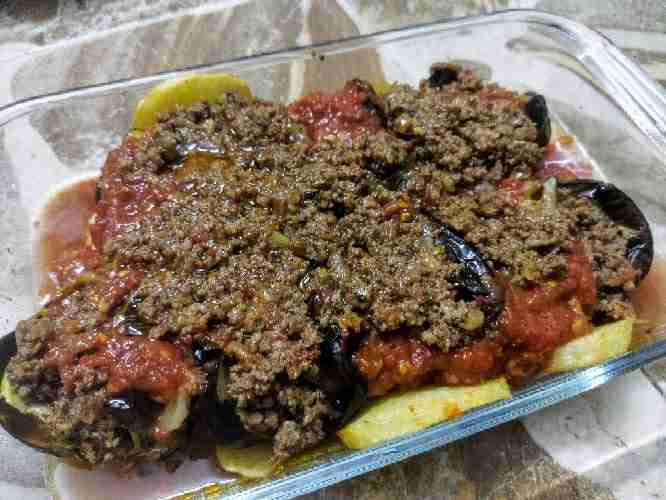 وبنبلش محشي حبات الباذنجان بصينية مدهونة بالزيت بنصف البطاطا وبعدين بنصف حبات الباذنجان وحطيت عالوجه بصل وفليفلة مقلية وبعدين نزلت البندورة المطبوخة ونزلت نص كأس مع ملعقة معجون الطماطم ويلي زادت من اللحمة زينت بيها الوجه ودخلتها فرن لمدة نص ساعة وهيك صارت جاهزة
