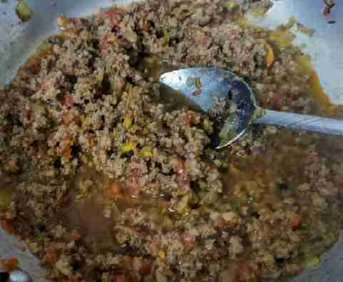 اول مرحلة بنضيف ثلاث معالق سمنة اوزيت بمقلاة وبنضيف عليها بصل مفروم ناعم وبنحرك لحتا ياخذو البصل اللون الذهبي وبنضيف اللحمة وبنحرك مدة دقيقتين وبنضيف عليها بندورة مفرومة ناعم وبنضيف الملح والفلفل الاسود وبنتركها عالنار مدة دقيقة وبنطفي بنقشر حبات الباذنجان وبنقليها لحتا تأخذ اللون الذهبي وبنقشر البطاطا وبنقطعهادوائر وبنقليها كمان لحتا تأخذ اللون الذهبي
